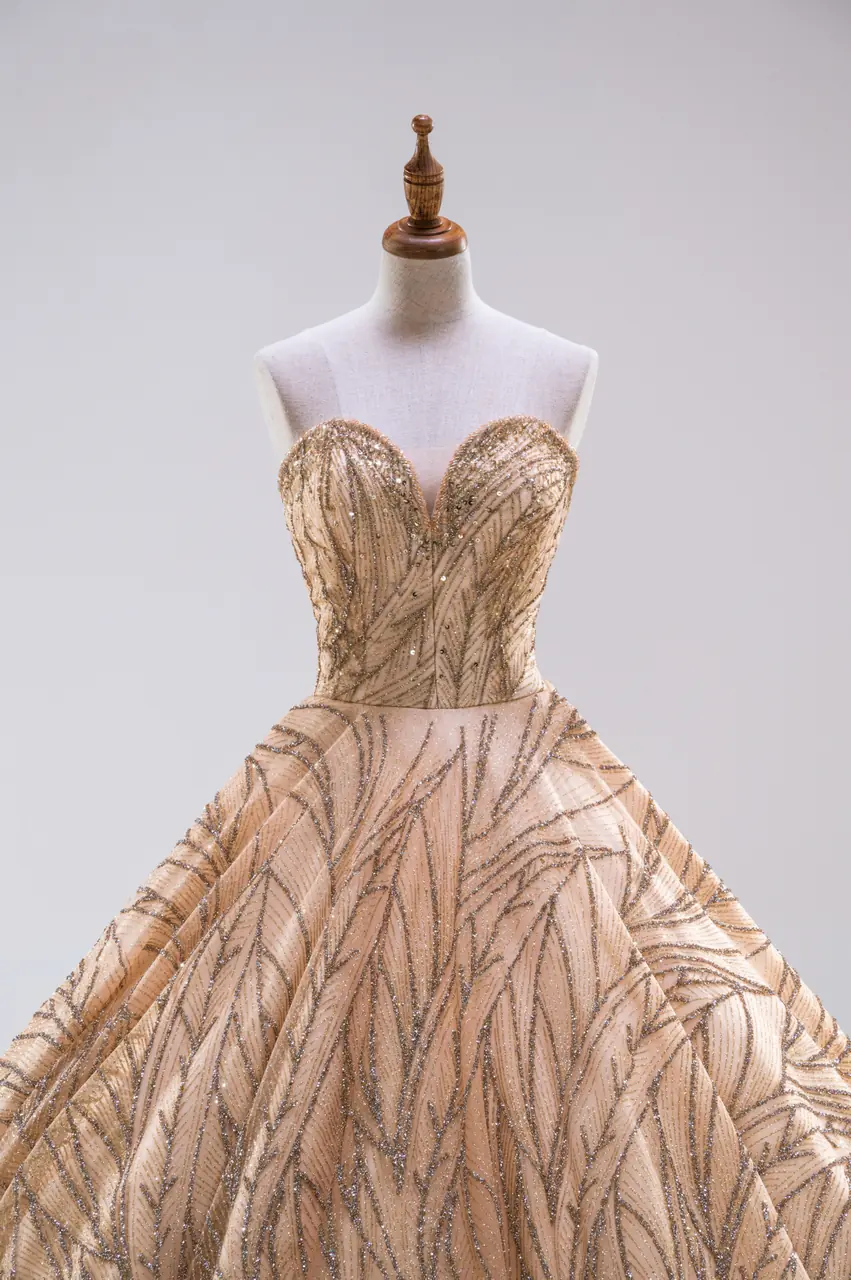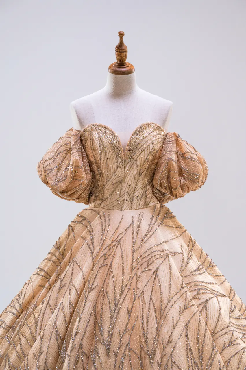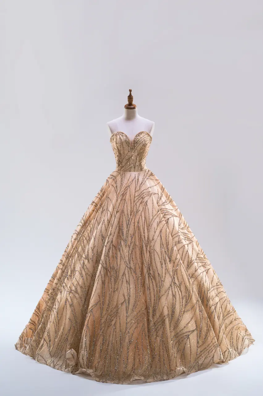 每一道金色的紋理,如山林間倦鳥歸巢時,天空灑下最後一段光。這件「琥珀枝語晚宴禮服」以寬鬆澎袖與桃心領開啟情緒的節點,異材質的厚實編織讓整體語彙更具雕塑感,彷彿穿戴者不只是出席,而是出場。繁複的琥珀織線交錯如枝似語,在燈火迷離間投射出隱含詩意且有分量的身影。如同深秋黃昏裡的一場私語,她是金色林間唯一的聽眾,也是最後說出心語的人。
