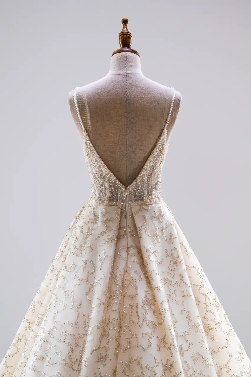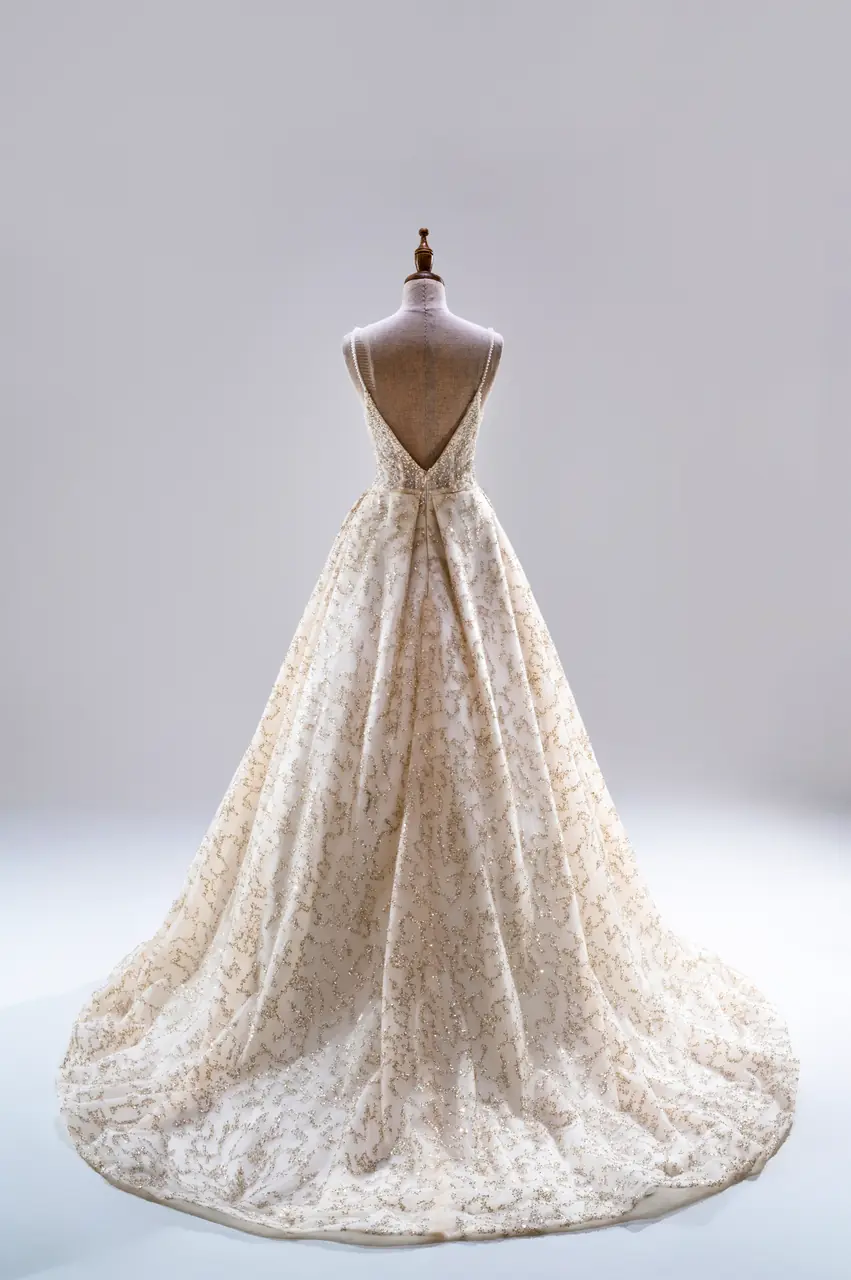這是一場深秋黃昏裡的私語,一襲香檳色的晚宴禮服,柔和而莊嚴,如金葉斜落。異材質的交織製造出如枝蔓般的光影肌理,密語著沉穩而內斂的情感。細肩帶與深V設計讓所有熱烈藏於靜謐之中,彷彿是日光最後的低語。當她穿起這身光影流曳的禮服,站立在光與影之間,那是一段靜好的記憶在心中緩緩鋪開,像一封未曾寄出的詩箋,輕輕,落地無聲,卻餘韻綿長。