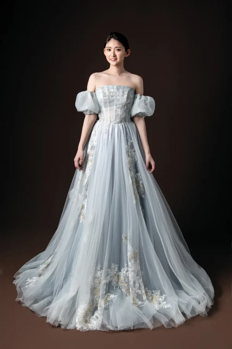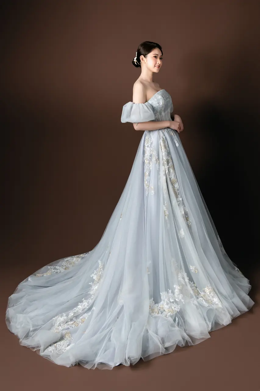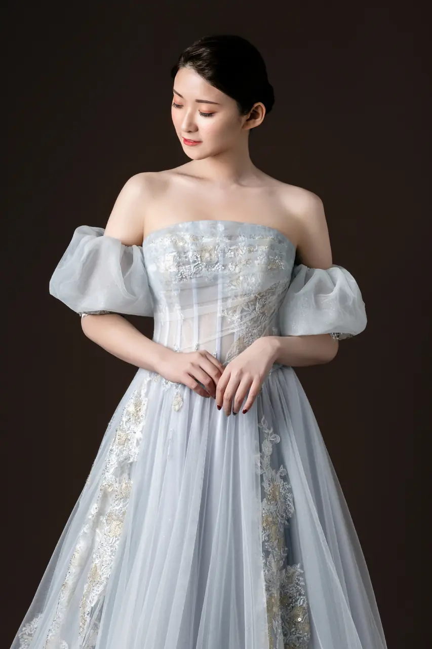 這件名為《靜謐頌歌》的晚宴禮服彷彿一首輕柔的樂章,穿行在暮色與微光之間。柔霧紫中透出銀灰的光影,猶如日暮時分天際最後一道微光,在靜默中飽含感懷。蓬鬆裙擺於步履中層層綻放,宛若翻閱一首舊詩;可拆卸的蓬袖設計,則如季節的流轉,能依心調節浪漫的分寸。蕾絲花紋靜靜盛開於紗間,如同記憶深處未說出口的情話,一針一線,纏綿於時光。這是為靜默深情而生的裙,唯一適合在心跳最慢時說出一個「我願意」的場域。