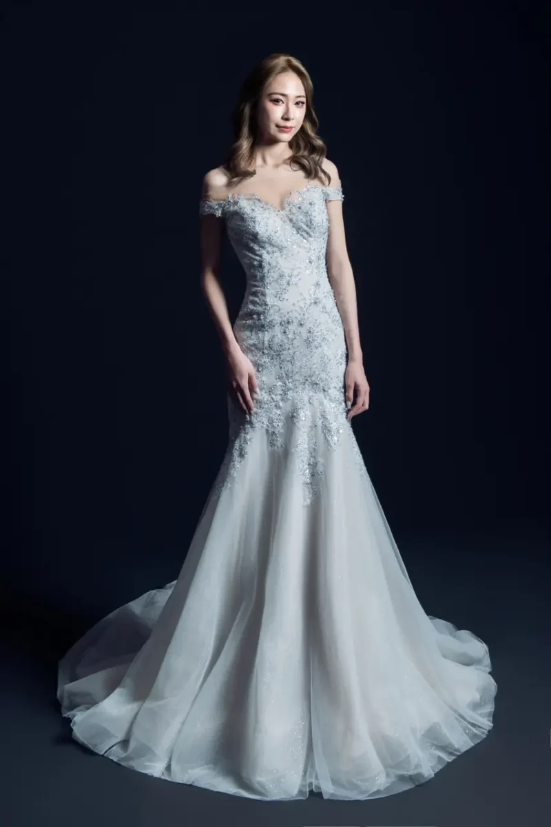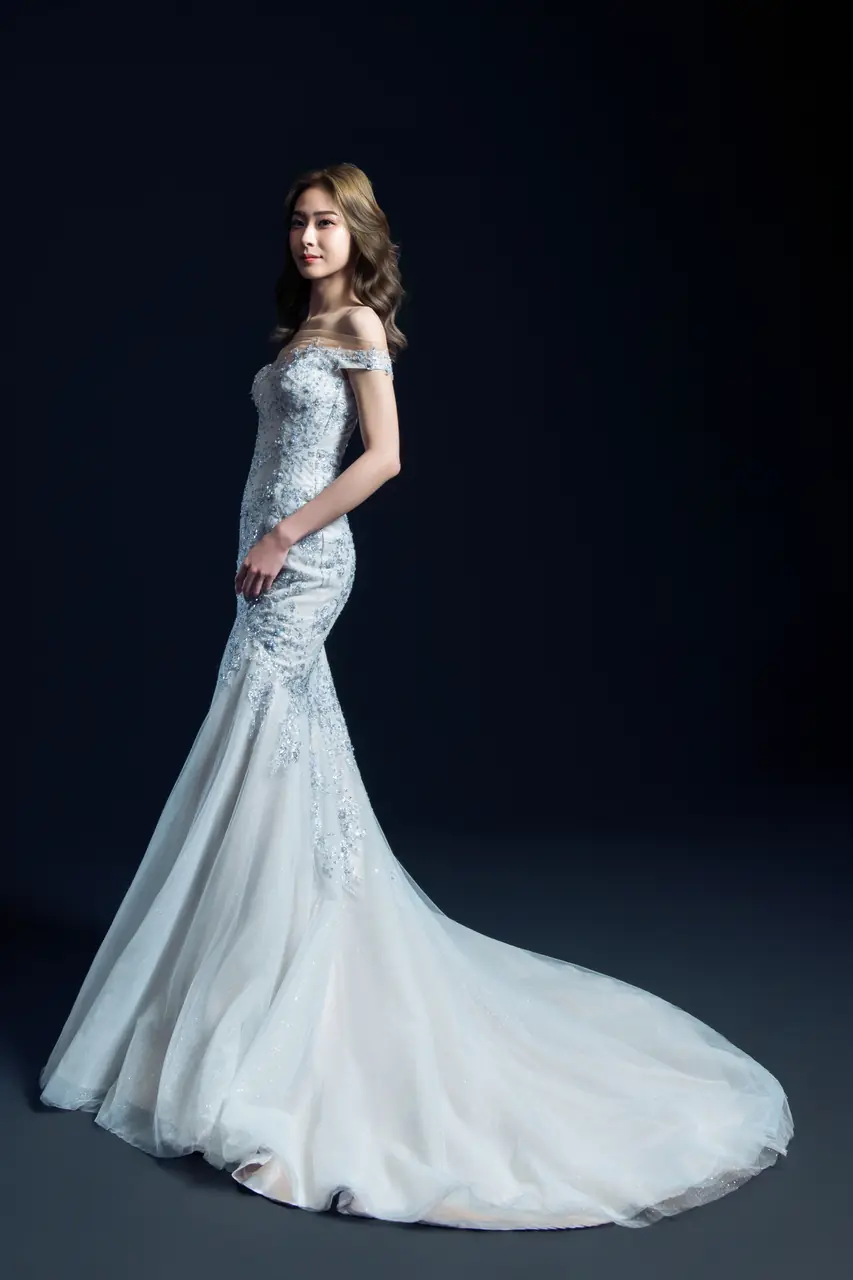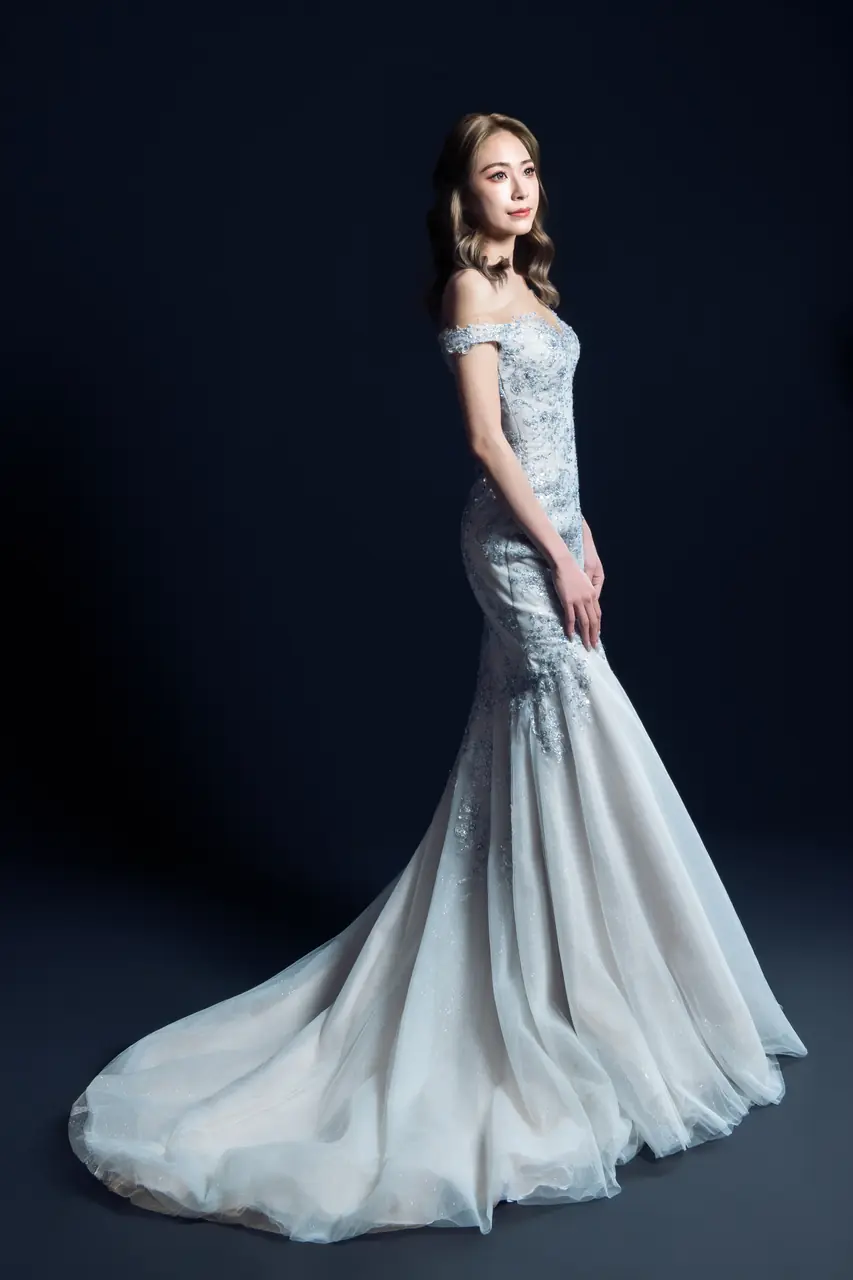 「煙灰花園晚宴禮服」是夜晚靜謐情緒的具象詩篇。灰絨如霧,鋪陳細緻蕾絲刺繡如蔓生花藤,從魚尾綻放宛如輕盈煙絮,彷彿每一步都漫過藏在花園深處的低語回聲。卡肩的線條收斂溫柔,一字領則像守著秘密的池面,泛著光而不語。這不是一件禮服,而是一段黃昏剛落、尚未入夜的時刻,關於等待、綻放與悄然改變心意的故事。