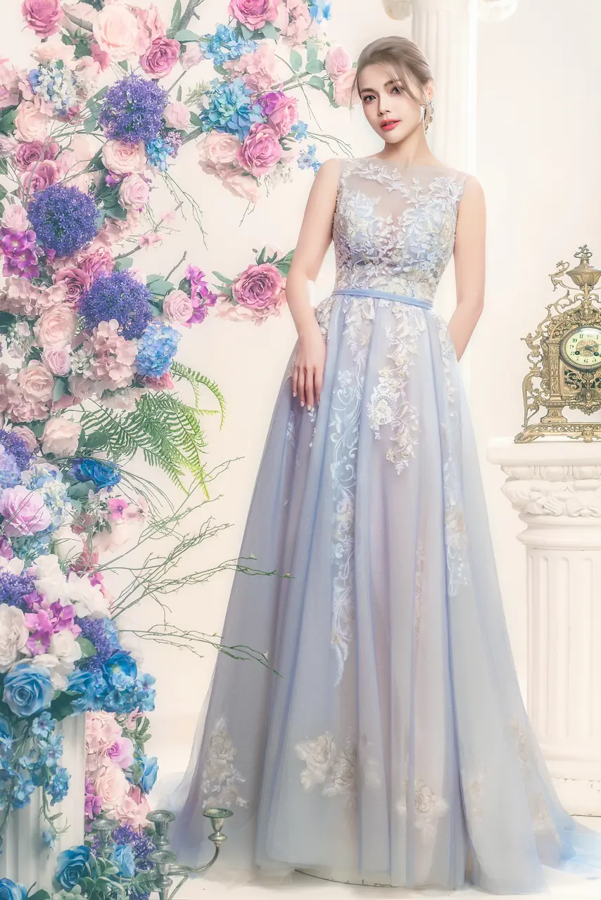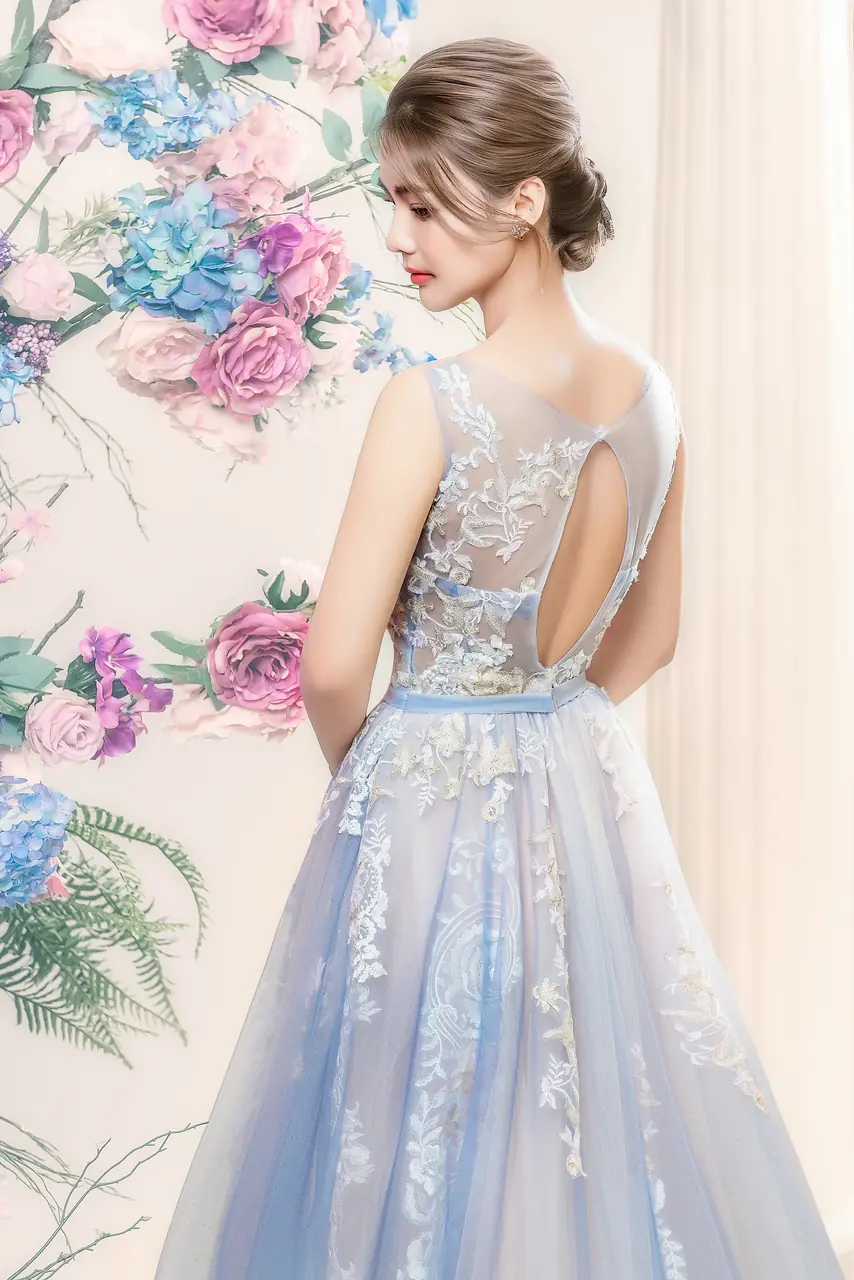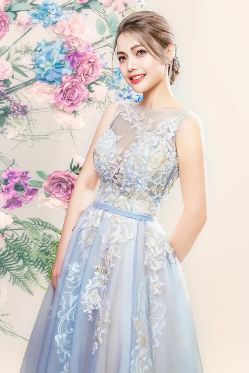當夜色還未完全沉下,花蔓悄悄透出紫靛微光,那是情緒在心湖泛漾的時刻。《暮瓣靛語晚宴禮服》以溫潤的紫色蕾絲編織情感肌理,如藤蔓般攀附、綿延至裙擺。圓領線條柔和而知性,背心剪裁則讓每一寸光影在肩骨間輕巧遊走。開叉設計猶如一道敞開的心口,迎接夜的溫柔與情緒的晃動。它不只是衣裳,而是一場關於內斂、關於期望、關於在寂靜中誕生的華麗。