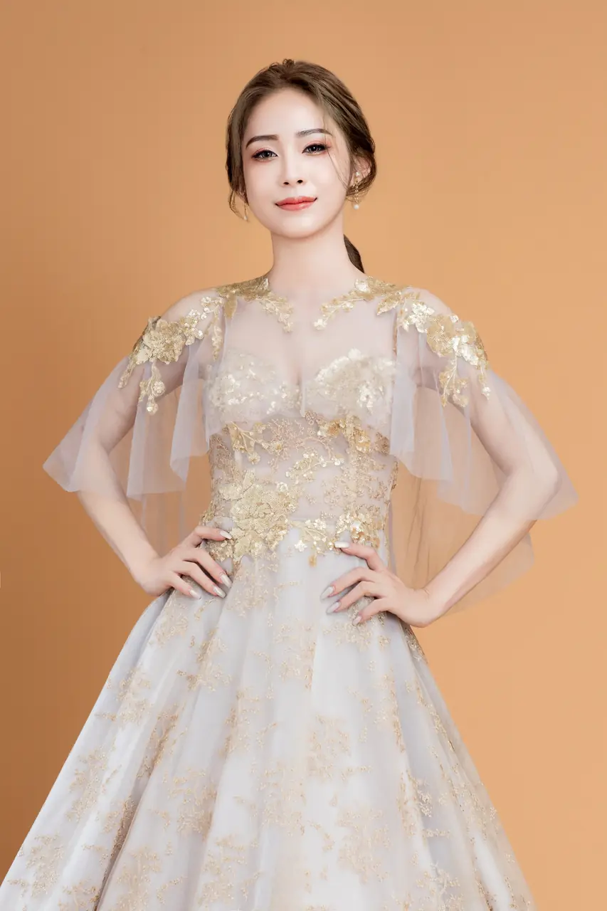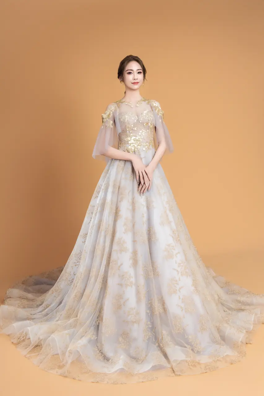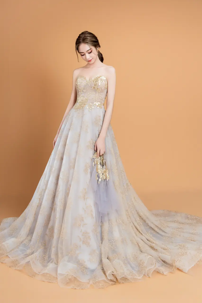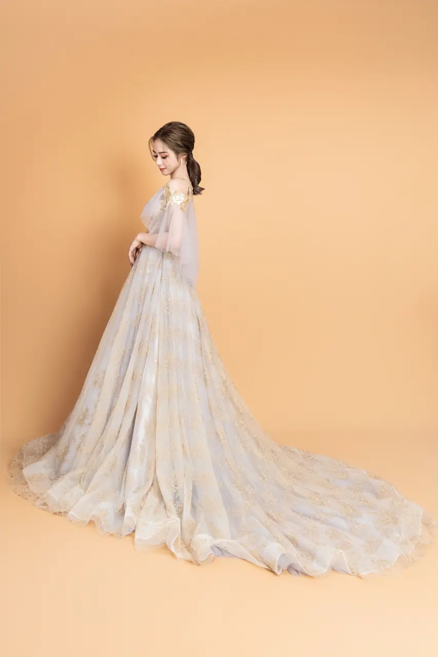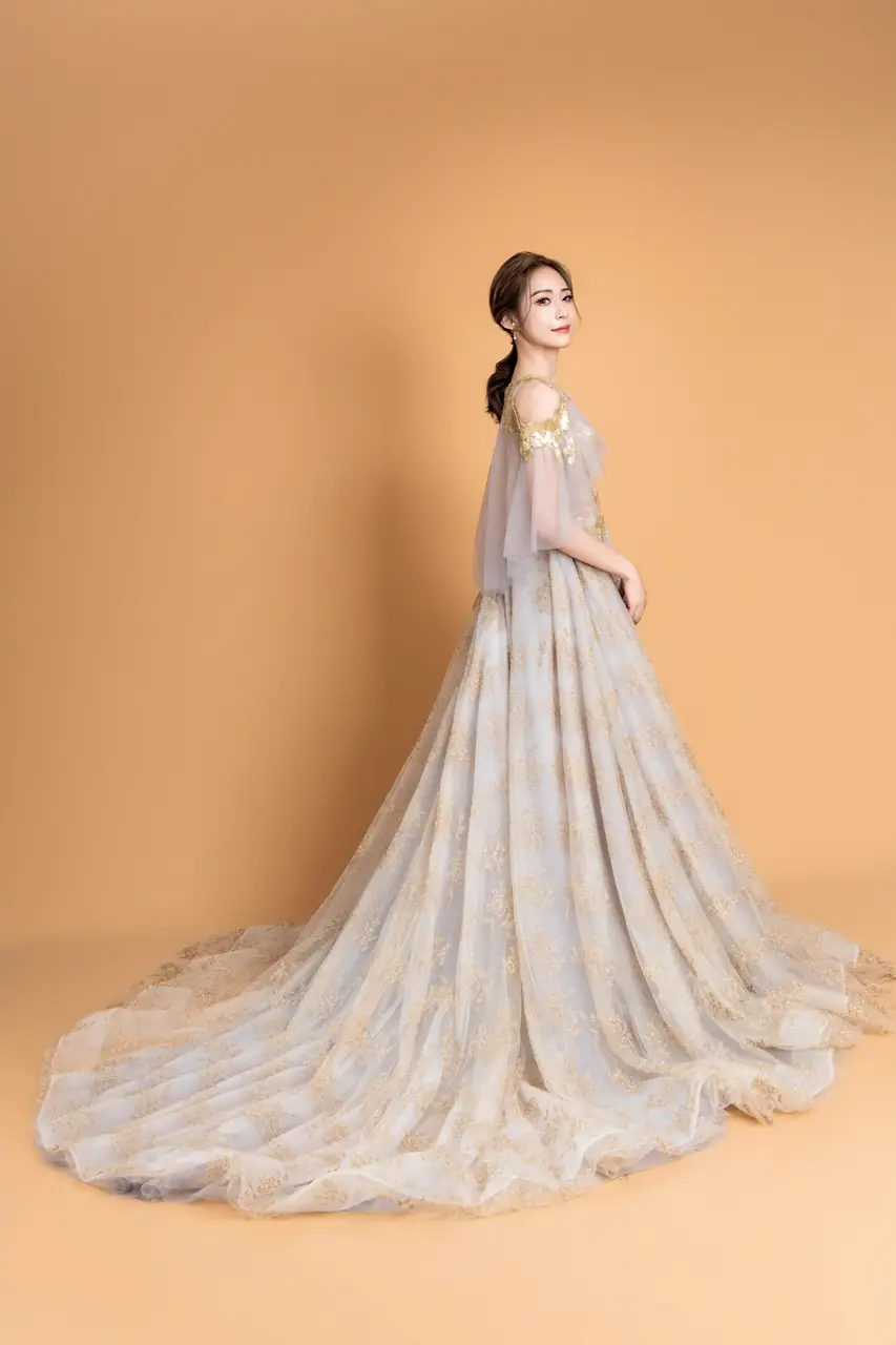 在古老碑林的幽靜深處,晚風微動,落葉帶著金粉紛紛低垂,那是記憶輪廓最後發光的瞬間。這款晚宴禮服,以紫灰為底托起浮金蕾絲,如碑上斑駁銘記的情緒光影,在衣擺處緩緩展開,彷彿走入一場書寫情懷的黃昏儀式。桃心領形,如一則未完的詩句,無袖設計揭露勇敢與柔情交錯的靜默姿態——這不只是一件衣裳,更是守護過往與凝視未來的情感容器。