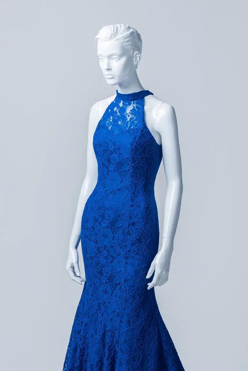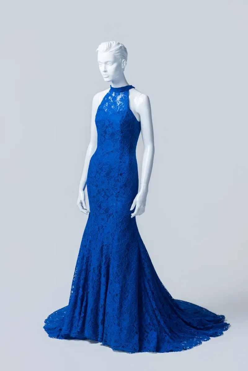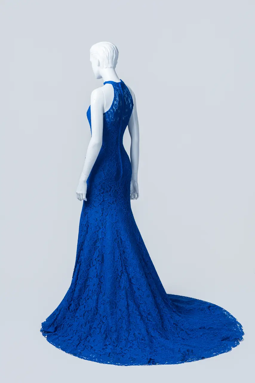 「鈷藍聲波晚宴禮服」捕捉的是一段深海之夜──無風的,卻滿是張力。蕾絲如同深處水紋,在她靜默移動中慢慢擴散,與魚尾設計一起彷彿在低語著內心的浪潮。精緻削肩雕塑出清醒而堅定的女性姿態,那不是羞怯的溫柔,而是自持的優雅。在一場剛開始前的靜默之中,她站著,如最深處的鈷藍,一種只存在夢外的顏色,寫下永恆的開場白。