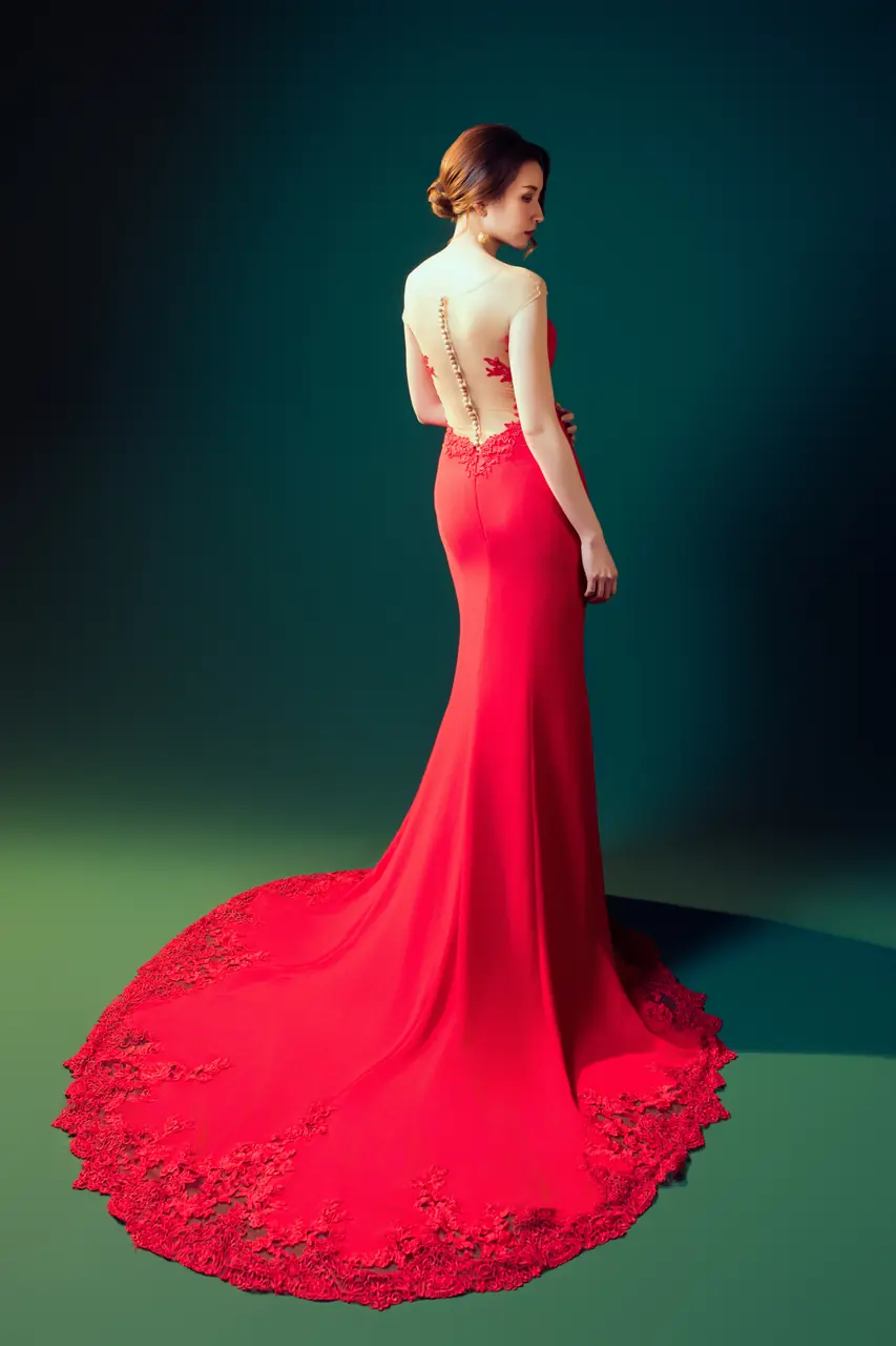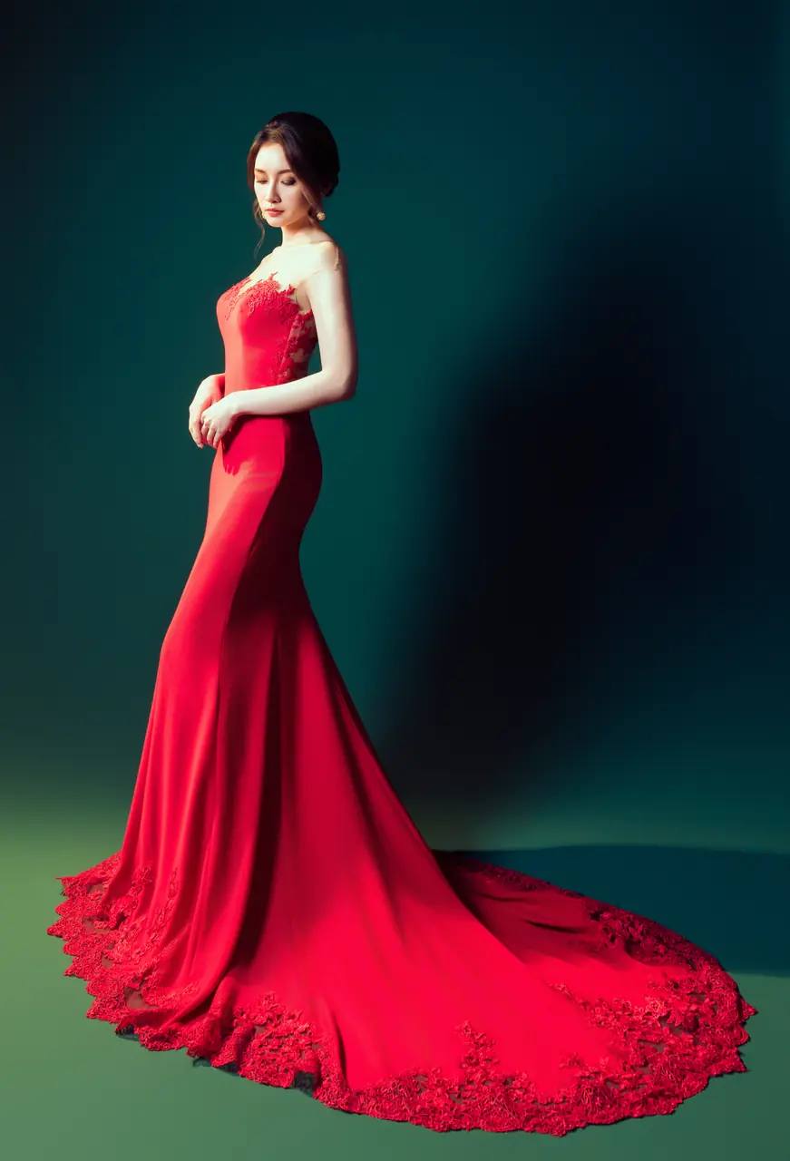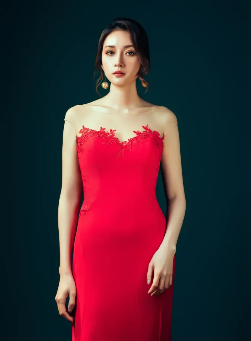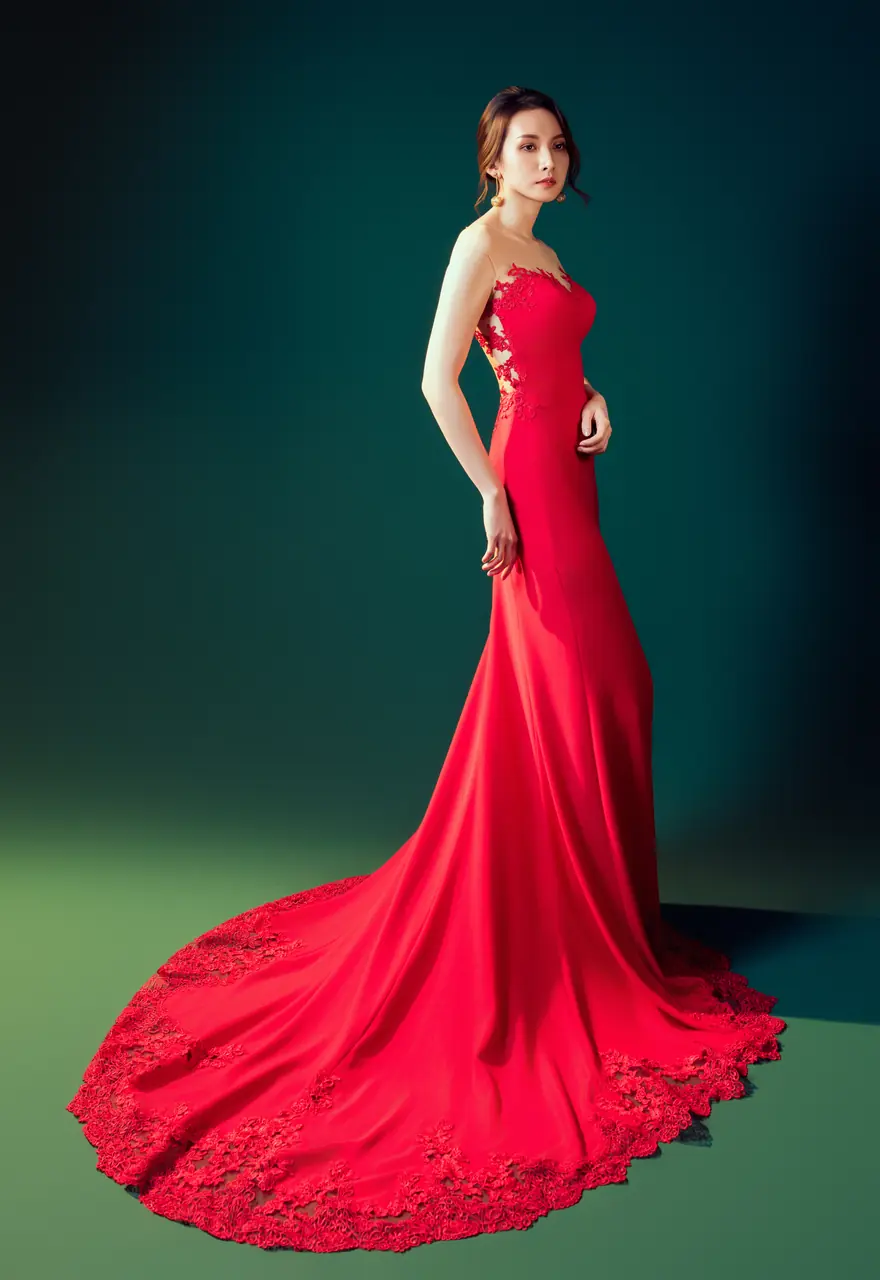 在深色幕布的靜夜之中,她佇立如火焰初燃。這件名為《焰語》的晚宴禮服,以緞面緋紅將沉靜與熱烈交織,桃心領的細緻刺繡彷彿情緒的裂縫,卡肩剪裁讓性感與克制恰好相遇。她不言語,卻每一步都如詩。這不是她的出場,而是她與靜默世界的對峙——不需證明,只需點燃賓客眼底的驚嘆。她,是宴會中無聲的主角,燃燒自己的瞬間,足以照亮整場夜色。