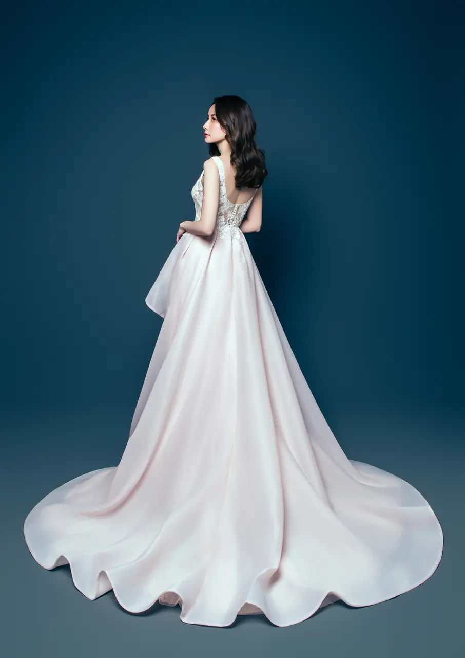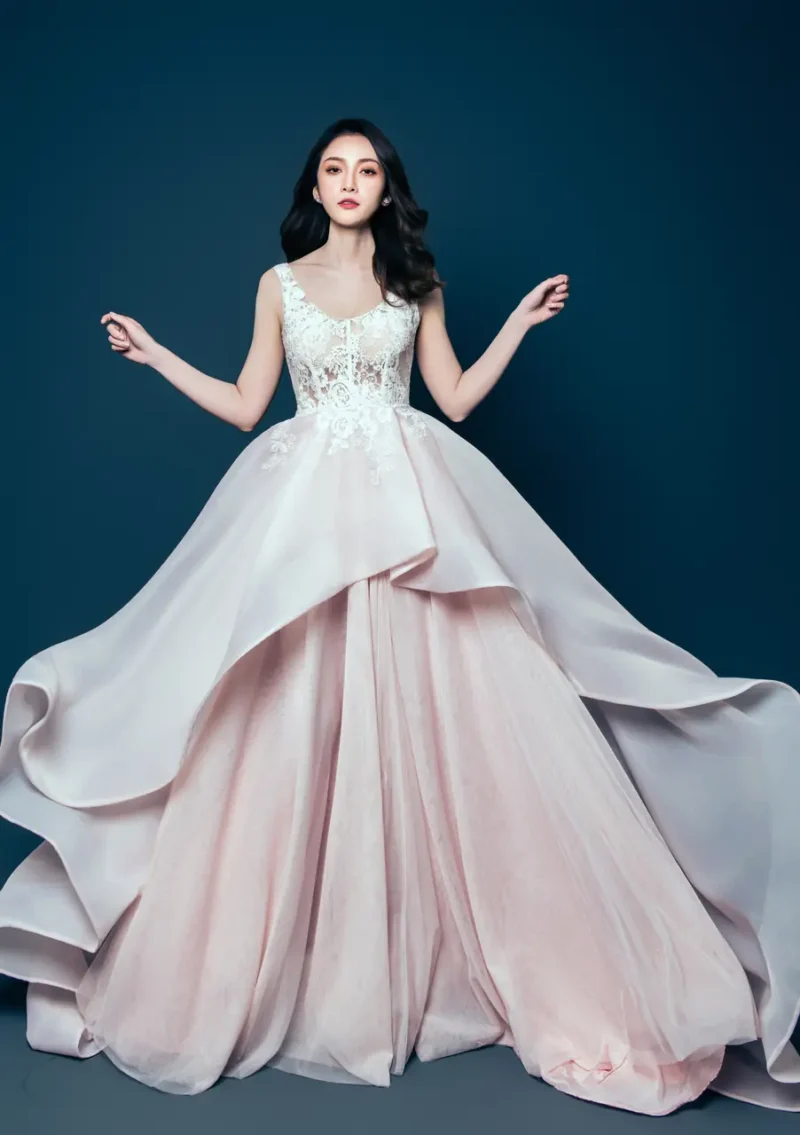 《玫瑰塵晚宴禮服》如一場舊夢中未醒的呢喃,於午夜浮現柔粉的裙影。蕾絲胸口勾勒出情感的輪廓,像信紙上未寄出的字句,脆弱、誠實卻無比動人。裙擺輕薄層疊,若玫瑰花瓣由夜色中緩緩展開,彷彿走進無聲劇場,那些未說出口的愛意,只能穿在身上,被光影輕觸。這是屬於內斂靈魂的禮服,它不張揚,卻永遠佔據人心深處柔軟的位置。
