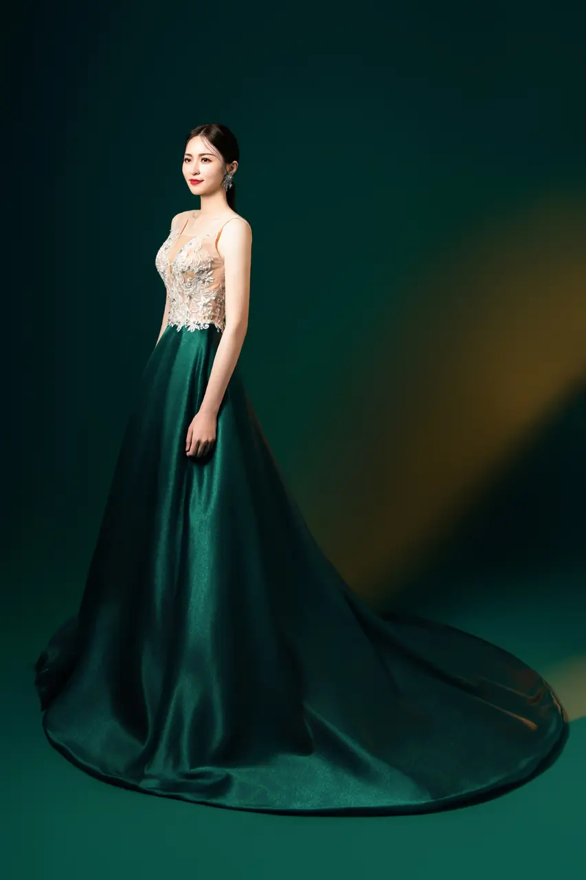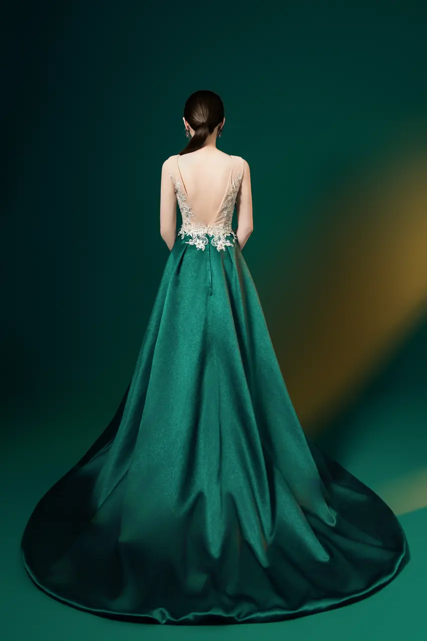 這是一襲為寂靜時刻編織而成的作品,名為〈靜林記〉。深而無聲的綠,如記憶中潮濕的森林,映照出心湖最深處的平靜與力量。上身以花草刺繡編織,象徵林中微光灑落枯枝上的生命意象;V 領與無袖剪裁如呼吸般自然,讓每一個動作都呈現詩意的克制與優雅。它不屬於喧囂,屬於夜宴中靜靜步入時,所有眼神默契轉向的那一刻——你是那片綠色深處最難以忽略的聲音。