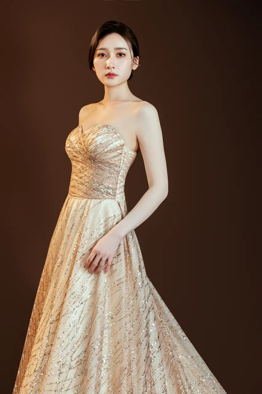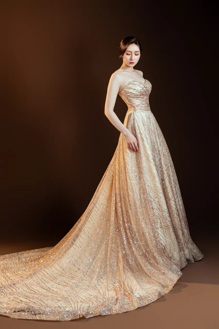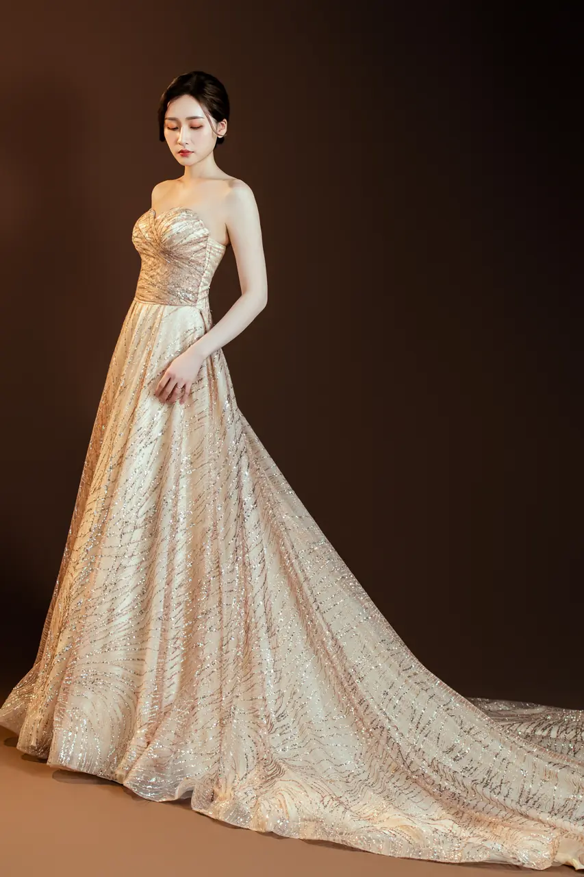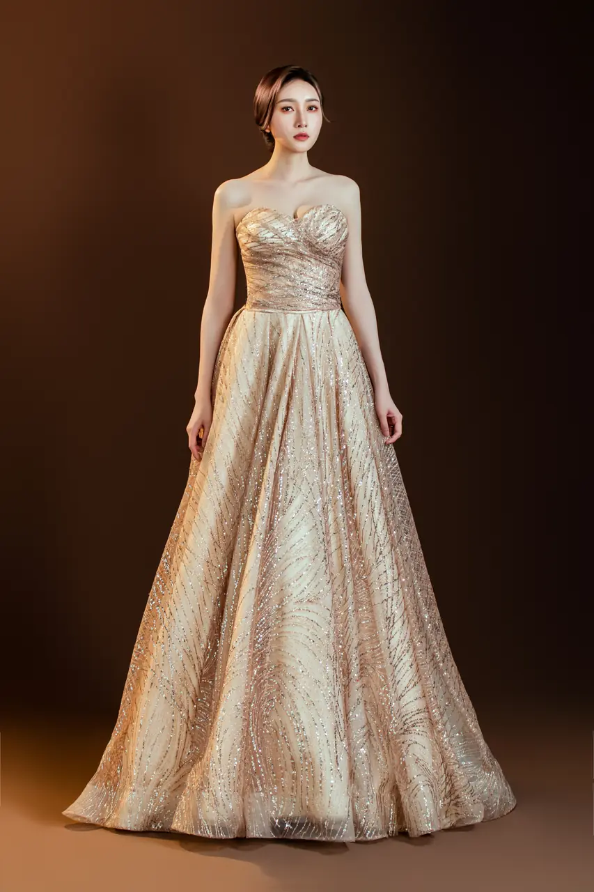 「鎏光之聲晚宴禮服」描繪的是一場無聲的深夜奏鳴,當香檳色的光澤輕輕滑過紗面,如時間緩緩洩露。猶如古老劇院中最後一盞燈未滅前的閃爍,這件晚禮服將寂靜收藏於紗質波紋中,每道閃爍如樂譜的音符,溫柔地存放著那些未曾說出口的微光情緒。澎裙隨空氣呼吸,彷彿輕輕一擺便可喚醒舞池中沉睡的年華,專屬於那些不張揚卻深刻的人,穿上它,便穿上了記憶裡最靜謐的夜。