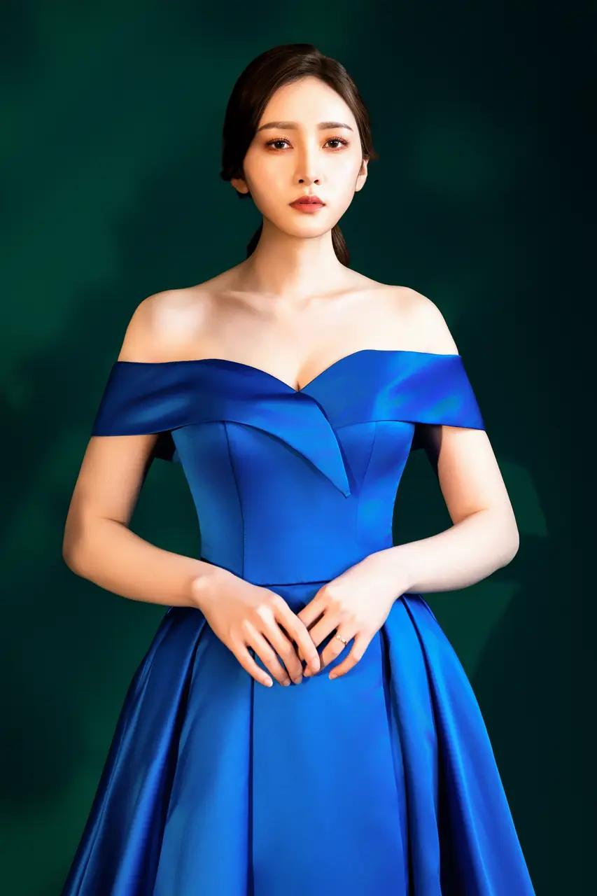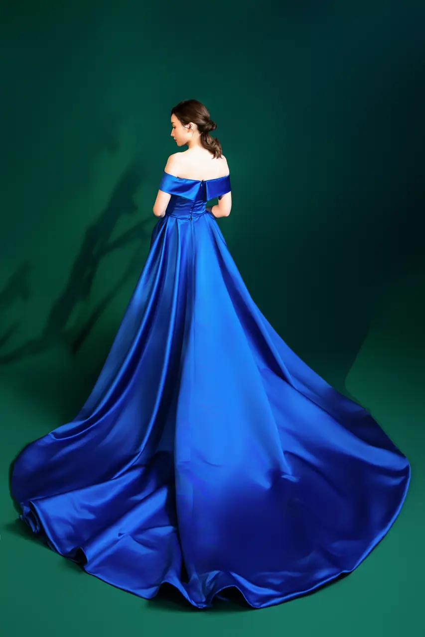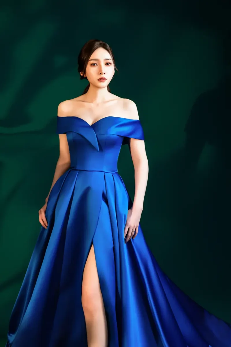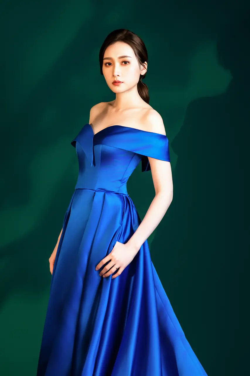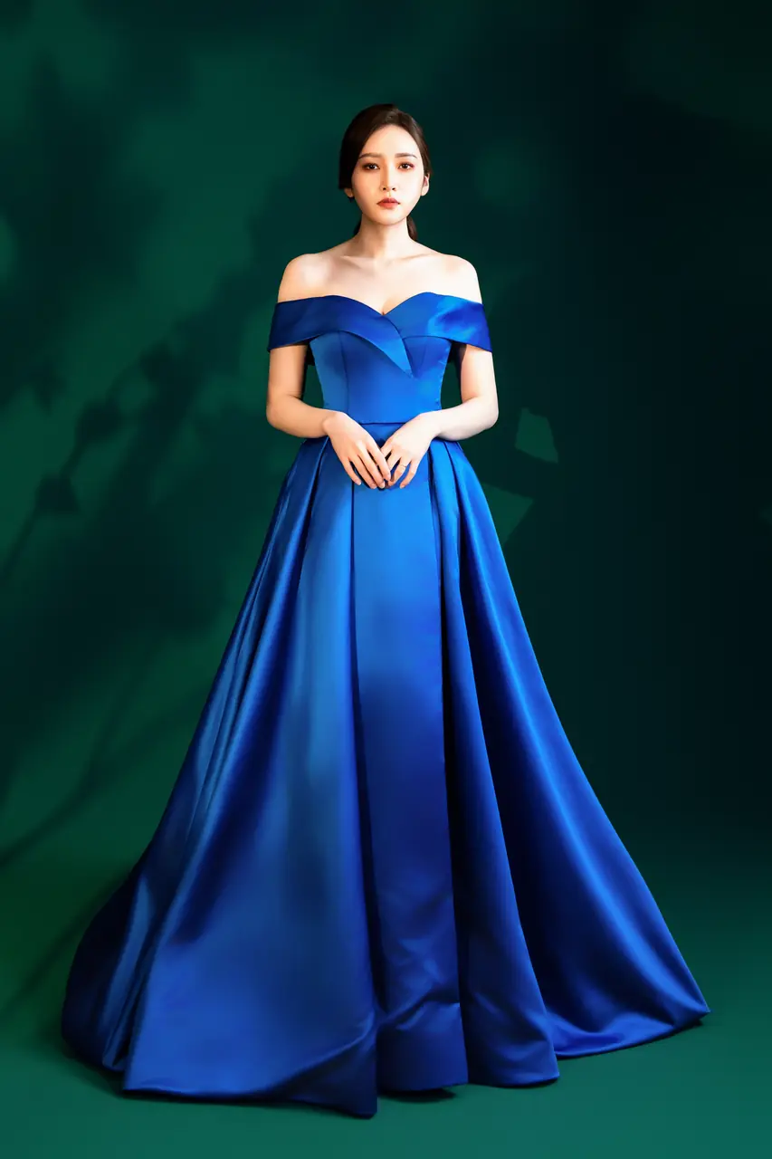 這是一件來自深海深處的低語。藍域低語晚宴禮服,選用沉穩如夜的藍緞,低肩線與桃心領交織出柔和與力量的矛盾詩。一道前開衩,彷彿一扇若隱若現的門,藏著關於她的秘密,也邀請未知的靠近。緞面如鏡,映出燈光幻影,也映出她內斂卻堅定的自我。這不是為了成為眾人焦點,這是她對自己的一場告白——在無聲的場景裡,她就是最深沉的聲音。