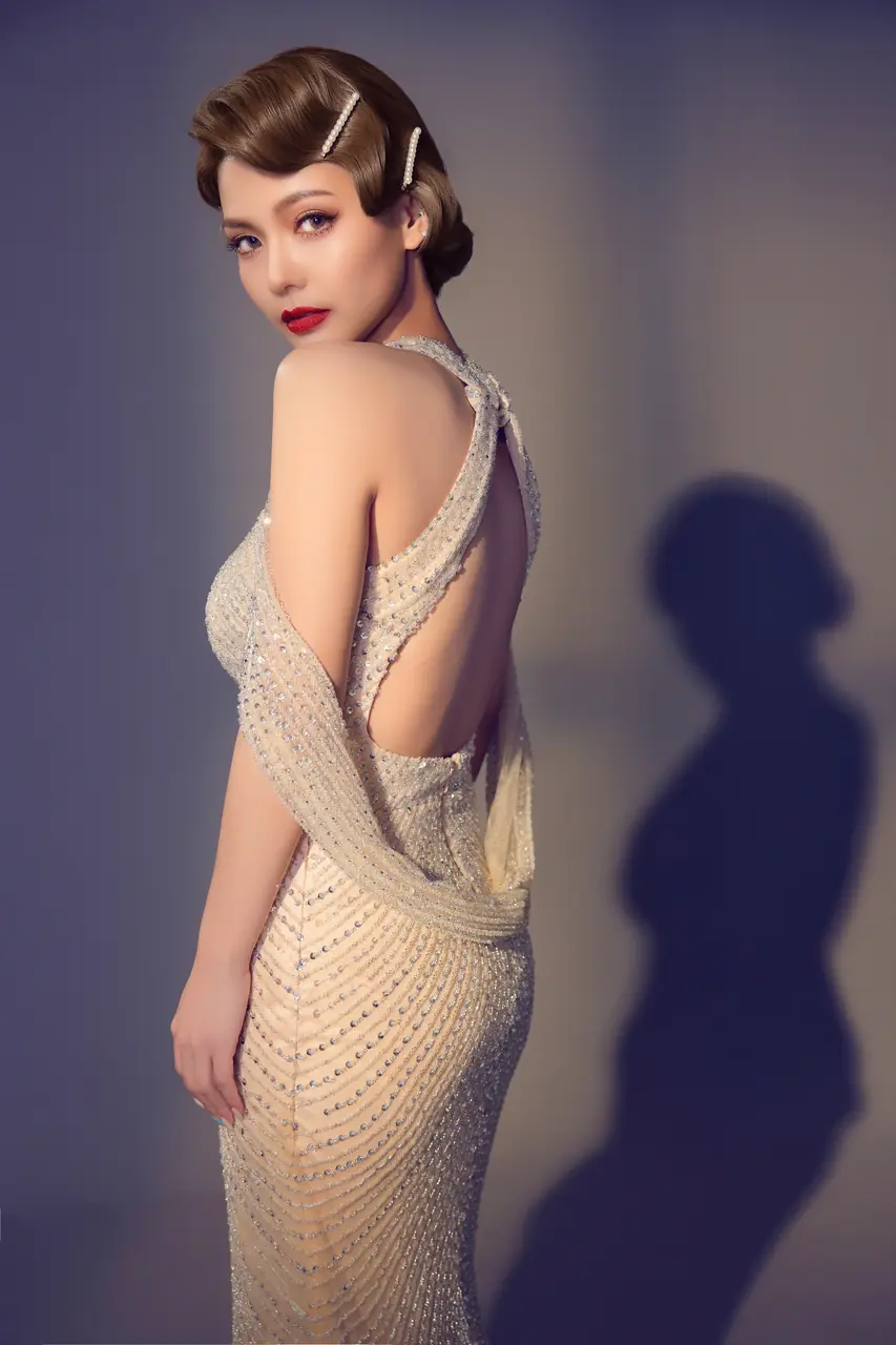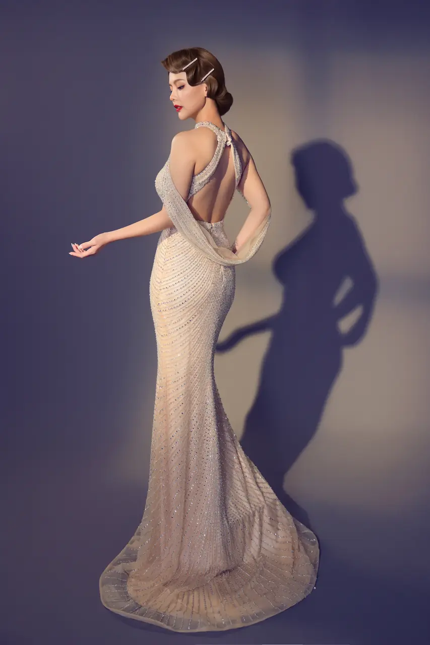 這是一場來自記憶深處的閃爍場景。如鎂光倒灌的老電影片段,『流光折射晚宴禮服』以香檳金交織流線紗面,描摹一位女子站在房間一角,被舊時光與燈影共同凝視的樣子。削肩與菱形領口銳利如意志,魚尾剪裁則隱藏她語句中的柔軟與深情。這不僅是一件晚禮服,而是一場舉止間,情緒悄然溢出的流動劇作。她站著,無需言語,就已貫穿整個夜晚的最美注目。