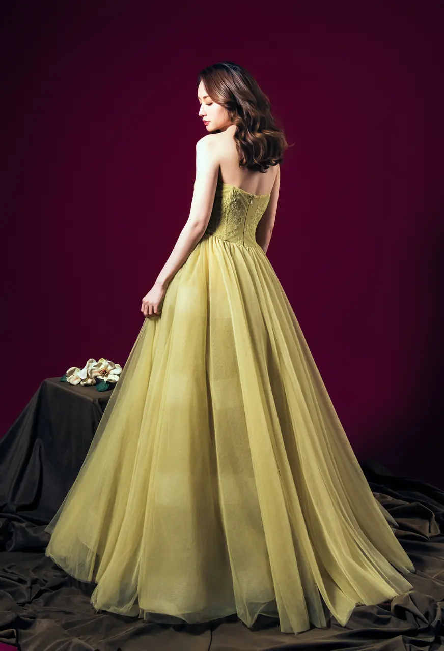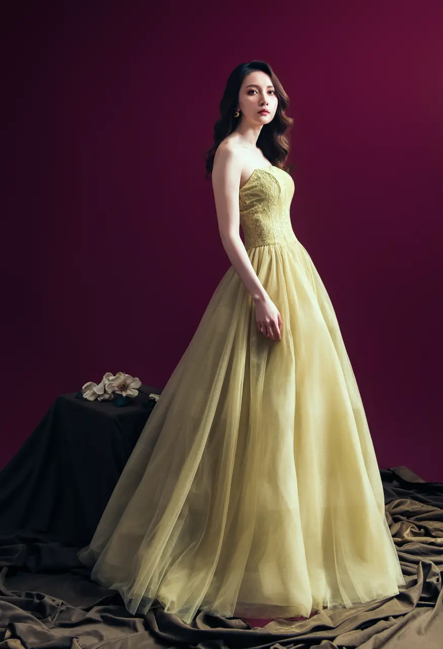 《梔光黃昏晚宴禮服》是一首寫給記憶深處的詩──如黃昏時分斜照的暖光,穿越塵埃與悸動,落在靜止的時刻。柔紗如霧,層層曖昧的氣息掩映著細緻勾勒的蕾絲,如黃梔未謝,盛放在屬於她的餘光背景。此刻沒有喧囂,只有一種無聲的深情從金棕間緩慢蔓延,呼應著她心中未竟的期待。適合秋日黃昏的婚禮、古典藝廊的私宴、或任何一場只需她自成焦點的夜,是為記得的人而生的設計,也是讓靈魂停留的一套衣裝。