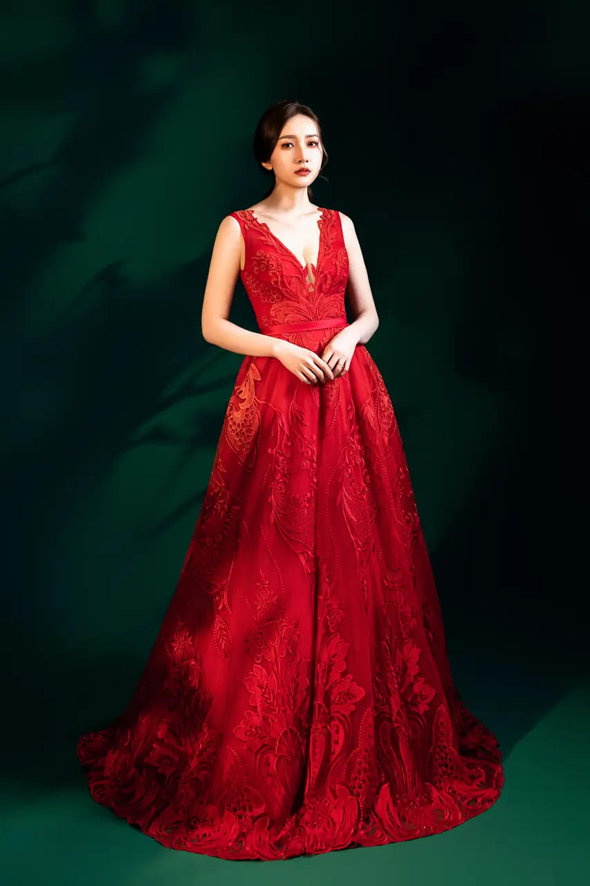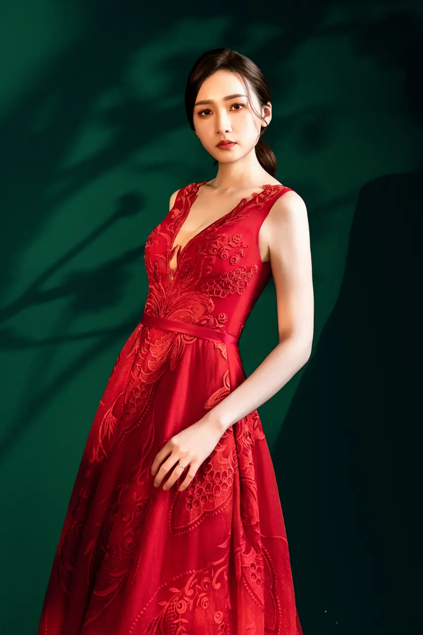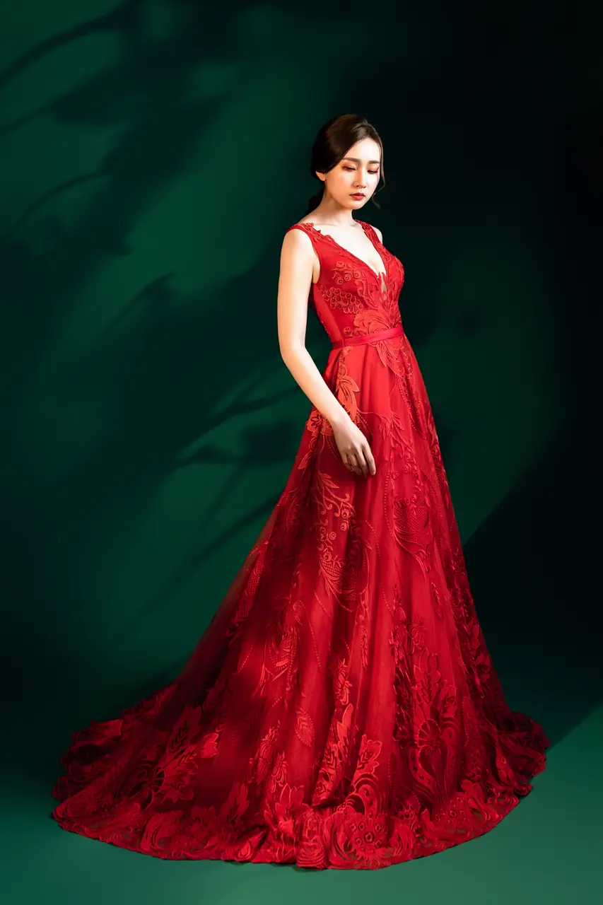 在光影斑駁的深綠幕後,一抹緋紅悄然綻放,如夜間綻放的藤花,幽靜而灼熱。這件《緋藤晚宴禮服》選用繁複蕾絲刺繡,在 V 領與澎裙交織出女性的堅定與柔韌。嵌藏的藤蔓圖騰如同無聲的低語,述說她的過往與選擇。這不是單純的亮相,而是一場沉靜中迸發情感流動的儀式——她選擇紅色,是因為她不再等待命運的邀請,而是親手點燃自己的舞臺。