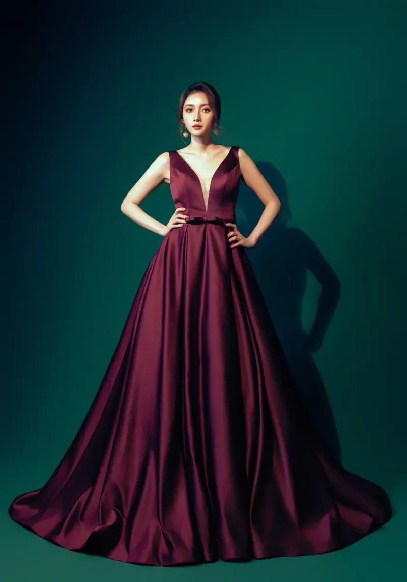 那一夜,她獨自走進宛如墨綠書房的空間,燈光灑落如詩,紅緞如紙,裙擺緩緩展開,彷彿正在展讀一則遲遲未說的心事。這件禮服以濃郁如紅酒的緞面,構築靜謐而堅定的姿態,V 領開口像停筆瞬間的呼吸,背心式剪裁灑脫純粹,如將情感摺疊成字句的動作——不急,卻充滿力量。《深夜書簡晚宴禮服》,為那些在安靜裡燃燒的靈魂而書。