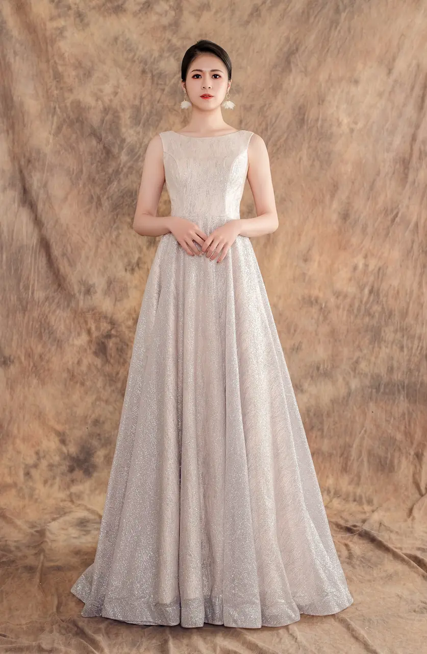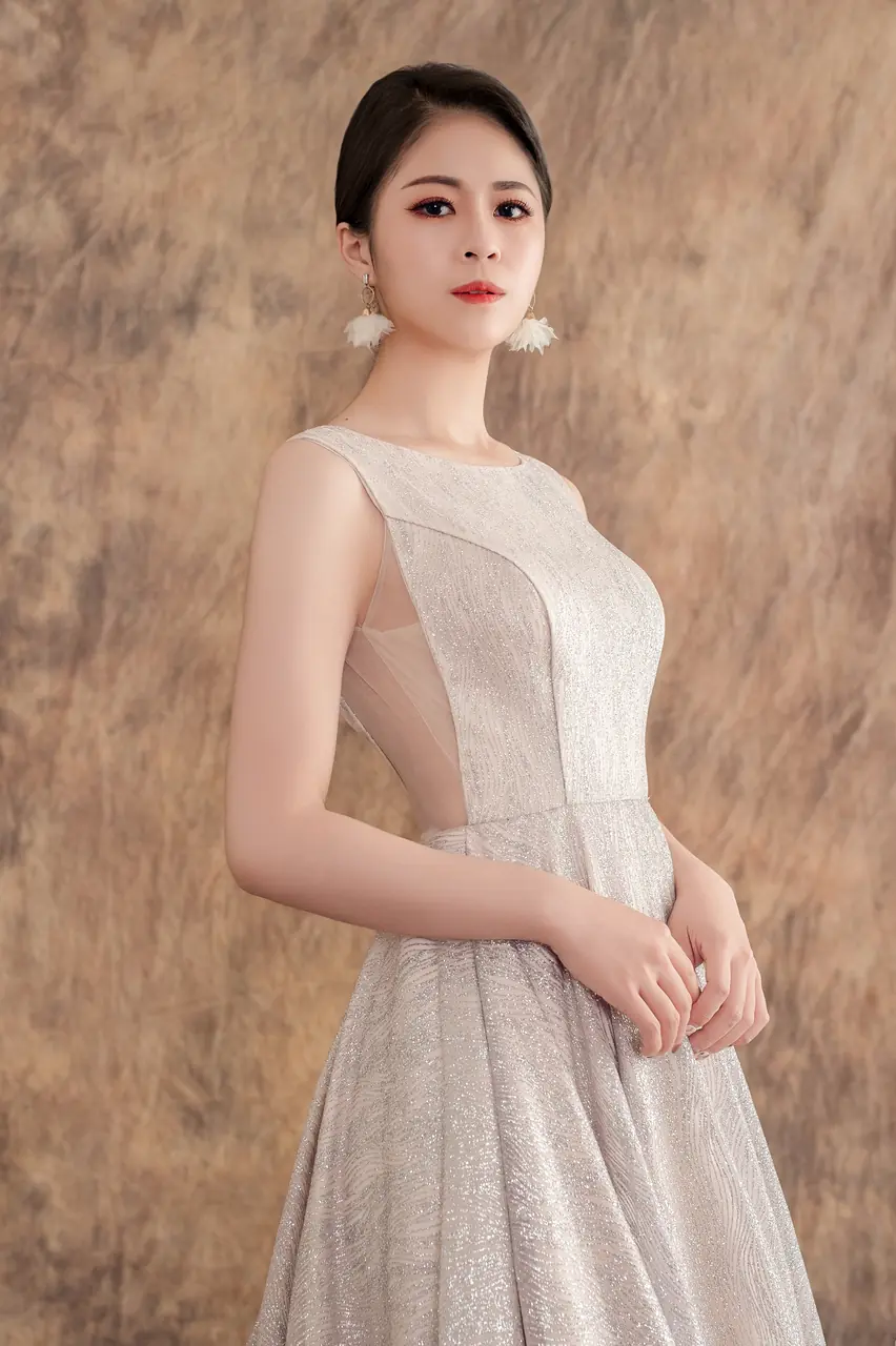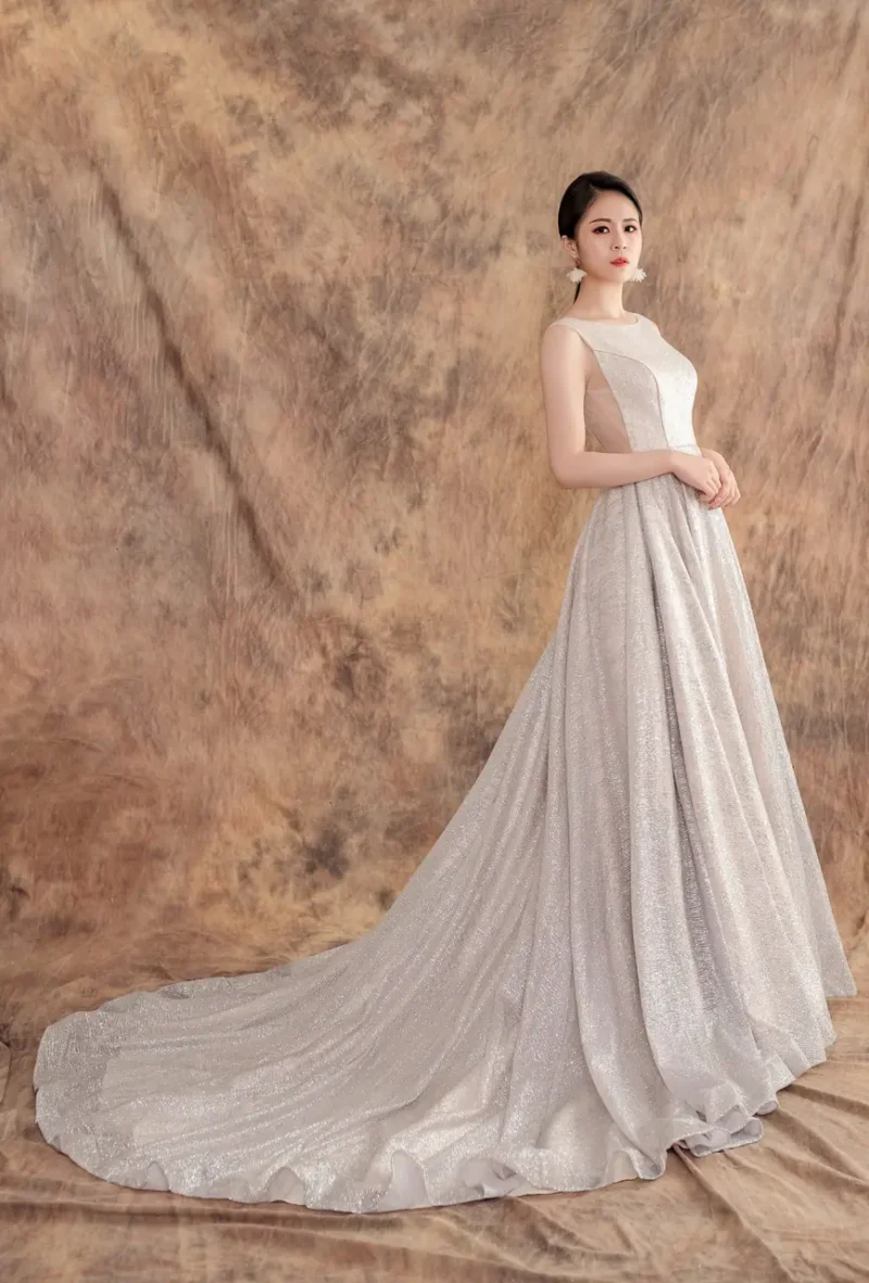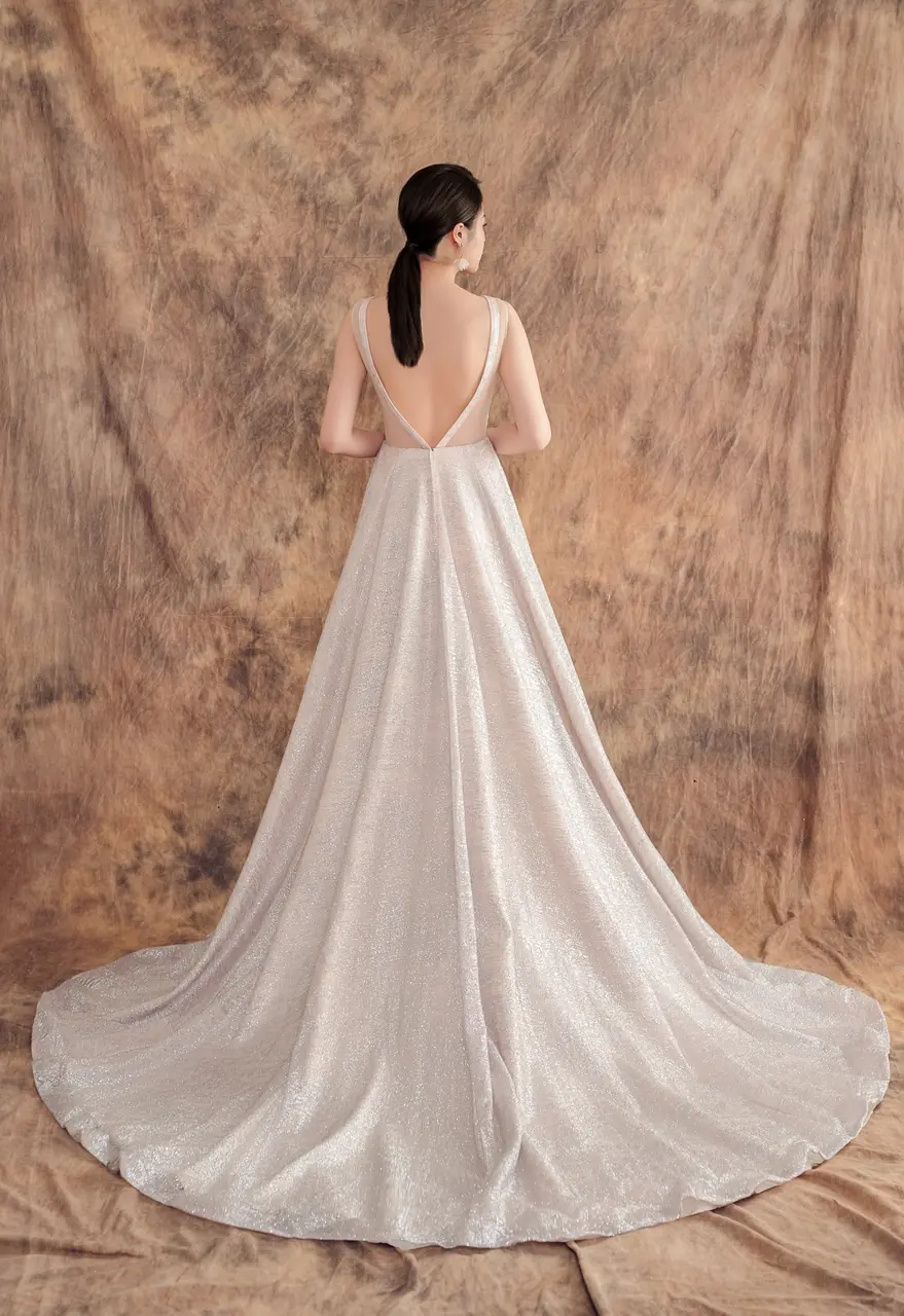 「礫光晚宴禮服」是一場地質與情感交織的靜謐疊影。設計靈感來自溪底礫石在黃昏時分的閃閃微光,禮服以純緞銀紋鋪疊,如同時間沖刷後留下的溫柔堅毅,帶著冰冷卻不失溫度的質感。無袖背心與圓領剪裁帶來俐落的現代感,而拖曳的裙襬則似靜水流動,在光與靜之中,藏納細膩情緒。這不僅是衣裳,而是一段無語的凝視,是她站在記憶邊緣、即將轉身的剎那。