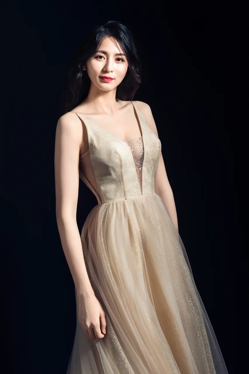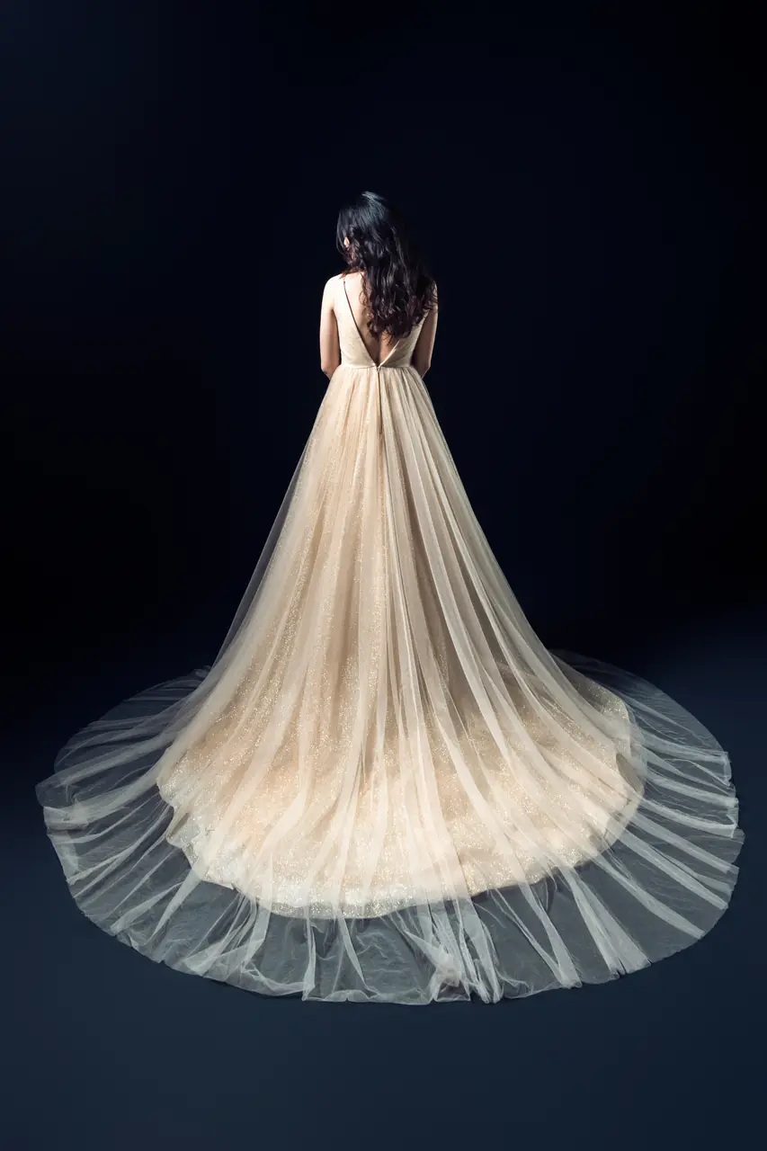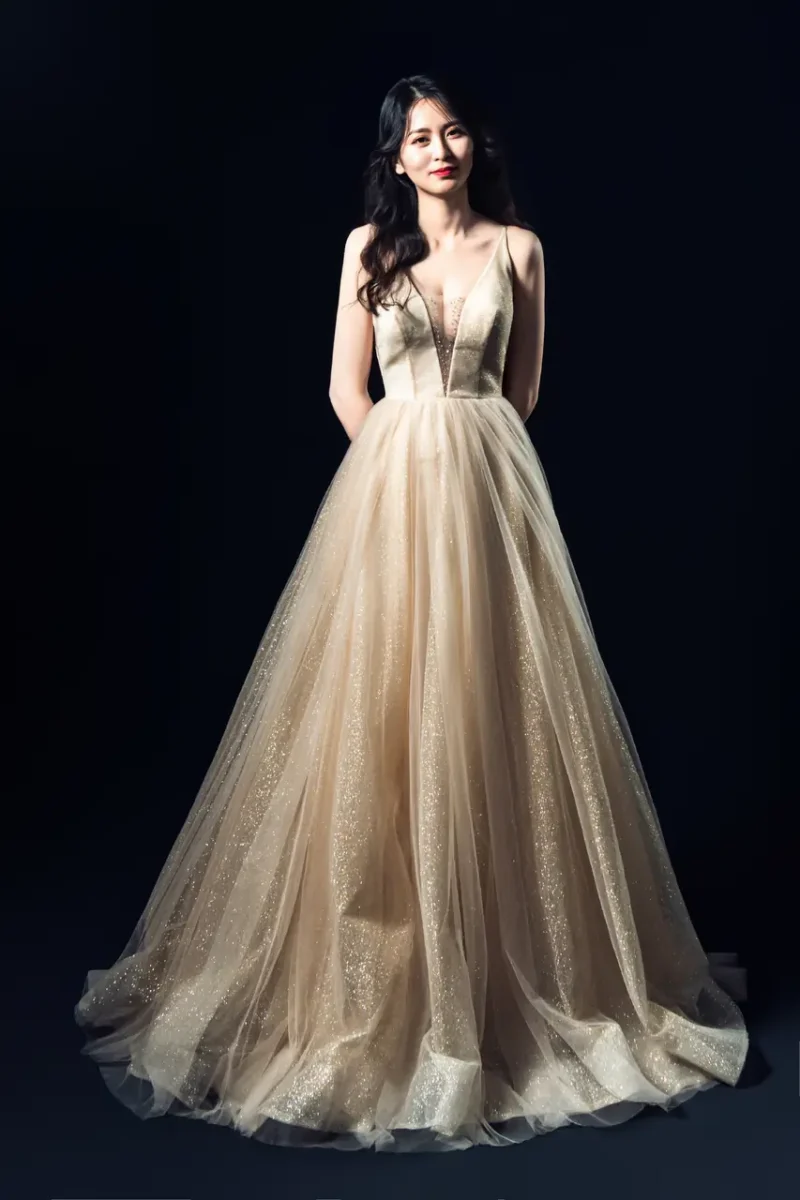 這是一襲專為靜謐時刻而生的晚宴禮服,如同夜裡無聲降臨的流光。金色紗質層層堆疊,閃爍如星塵瀰漫,澎裙在步伐間輕飄無聲,彷彿時光也在其中遲疑。細肩帶搭配極簡V領設計,映出女性最純粹的線條與風骨,如同她心中從未說出的那句話,在此刻被光擁抱。穿上它,是在靜默裡盛放自己的一場微光獨白。