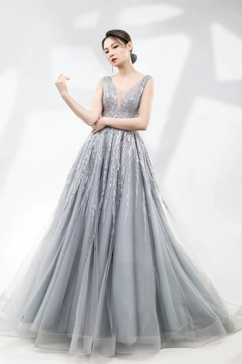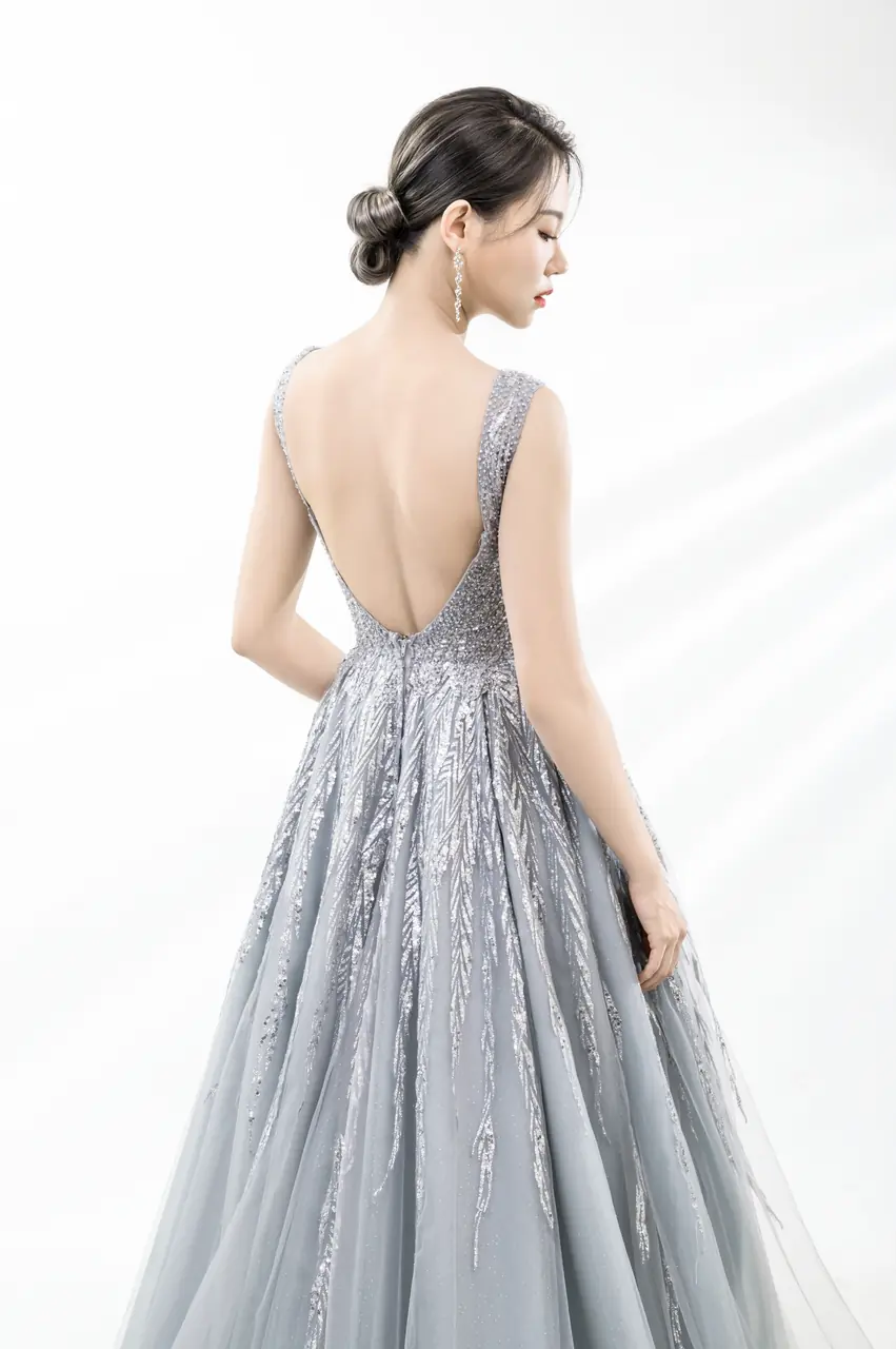 這件名為「靛雨光年」的晚宴禮服,如時光淋落後的天際片段,在暮色銀灰之中低語。繁複的銀色刺繡紋理,彷彿雨滴垂落於枝梢,細密地鋪展在紗質裙擺上。她不喧鬧,卻無可忽視 —— 彷彿每一縷縫線皆屬於內心某場暴雨的倒影。V領與背心式剪裁,是剛柔交織的界線,是風暴結束後,女子凝視未來的目光。此裙為夜而生,為盛宴而立,亦為那無聲的靈魂波動留下痕跡。