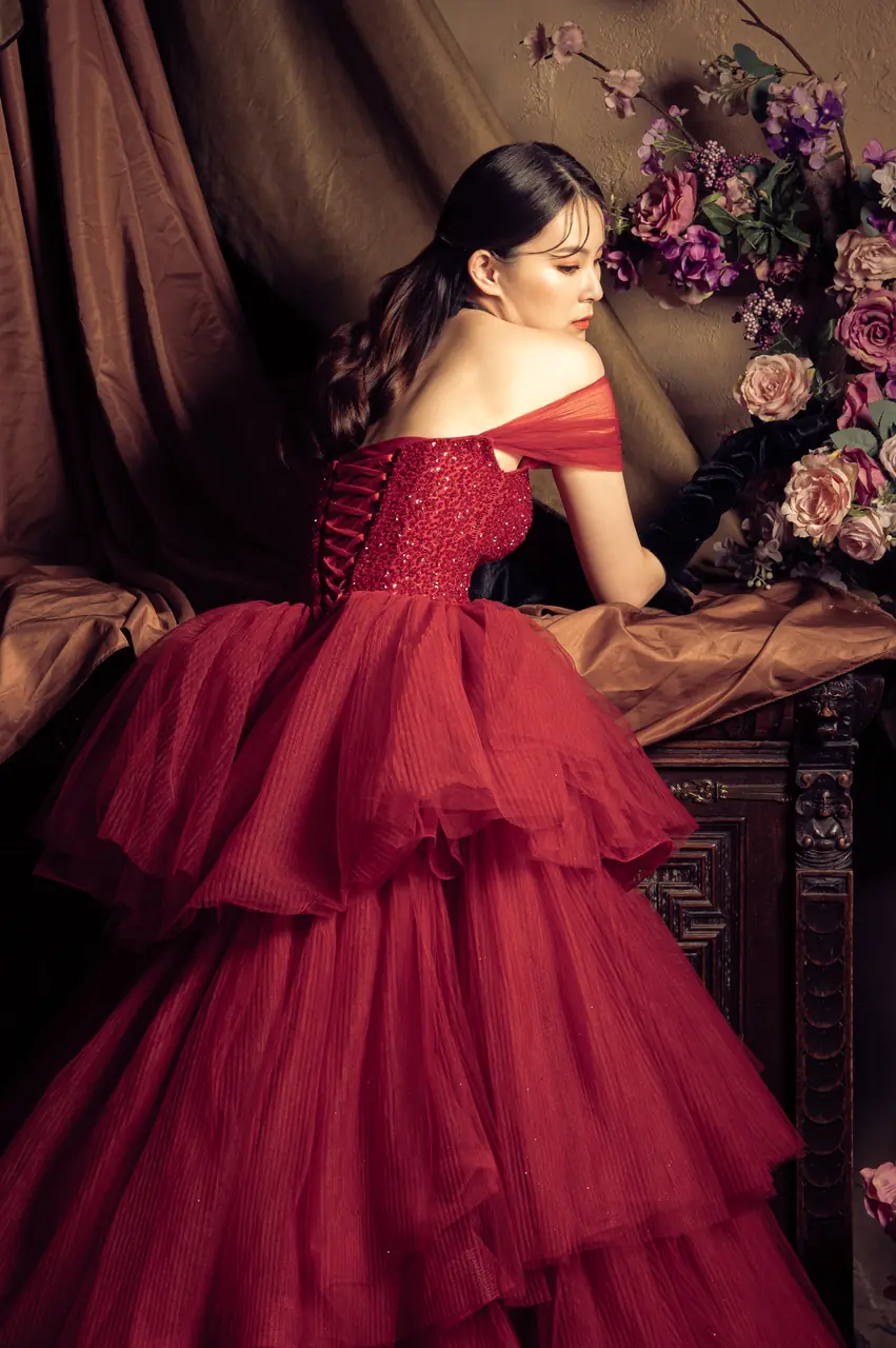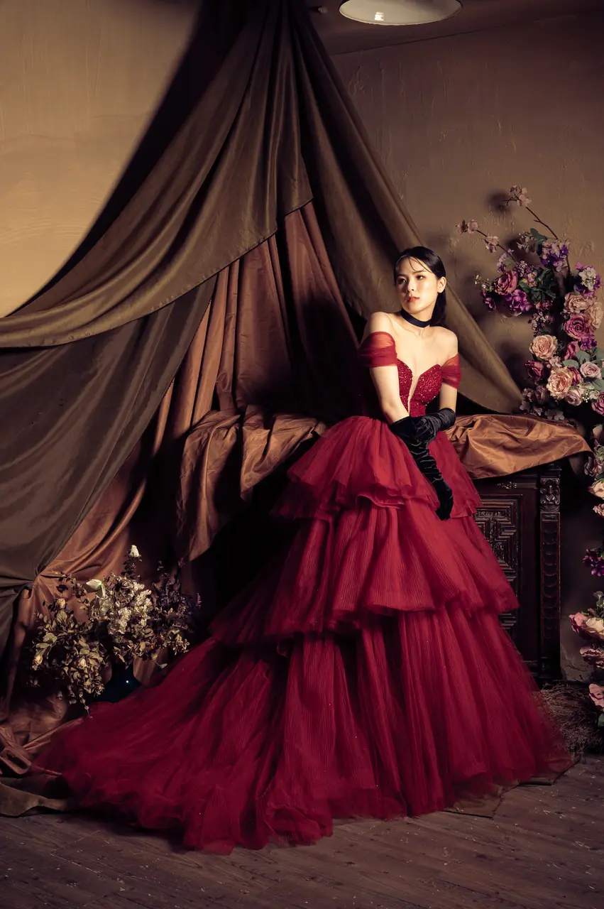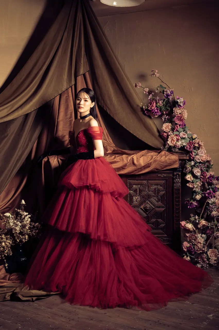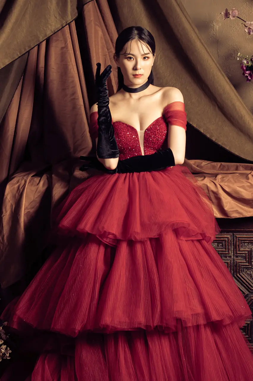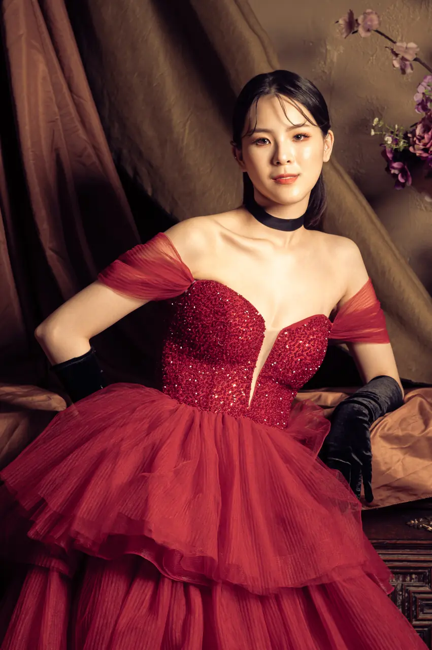 在古銅色天幕下,她靜坐於時間之外,紅色如焰,層層堆疊的紗裙彷彿燒盡的一頁詩。這件「薔羽焰語晚宴禮服」,以桃心領勾勒柔美心境,卡肩袖與深紅亮片閃爍低語,透出一股近乎貴族式的自持與感性。每道褶皺都是她不語的篇章,她不必說一句話,僅用眼神與姿態,點燃整個夜晚的劇場。適合出席最沉靜也最盛大的場合,讓情緒以最詩意的方式,站上舞台。