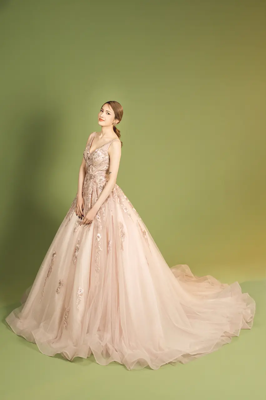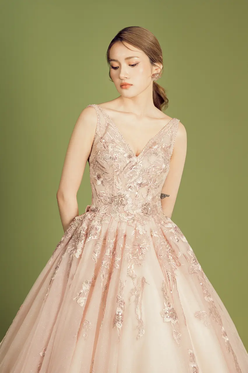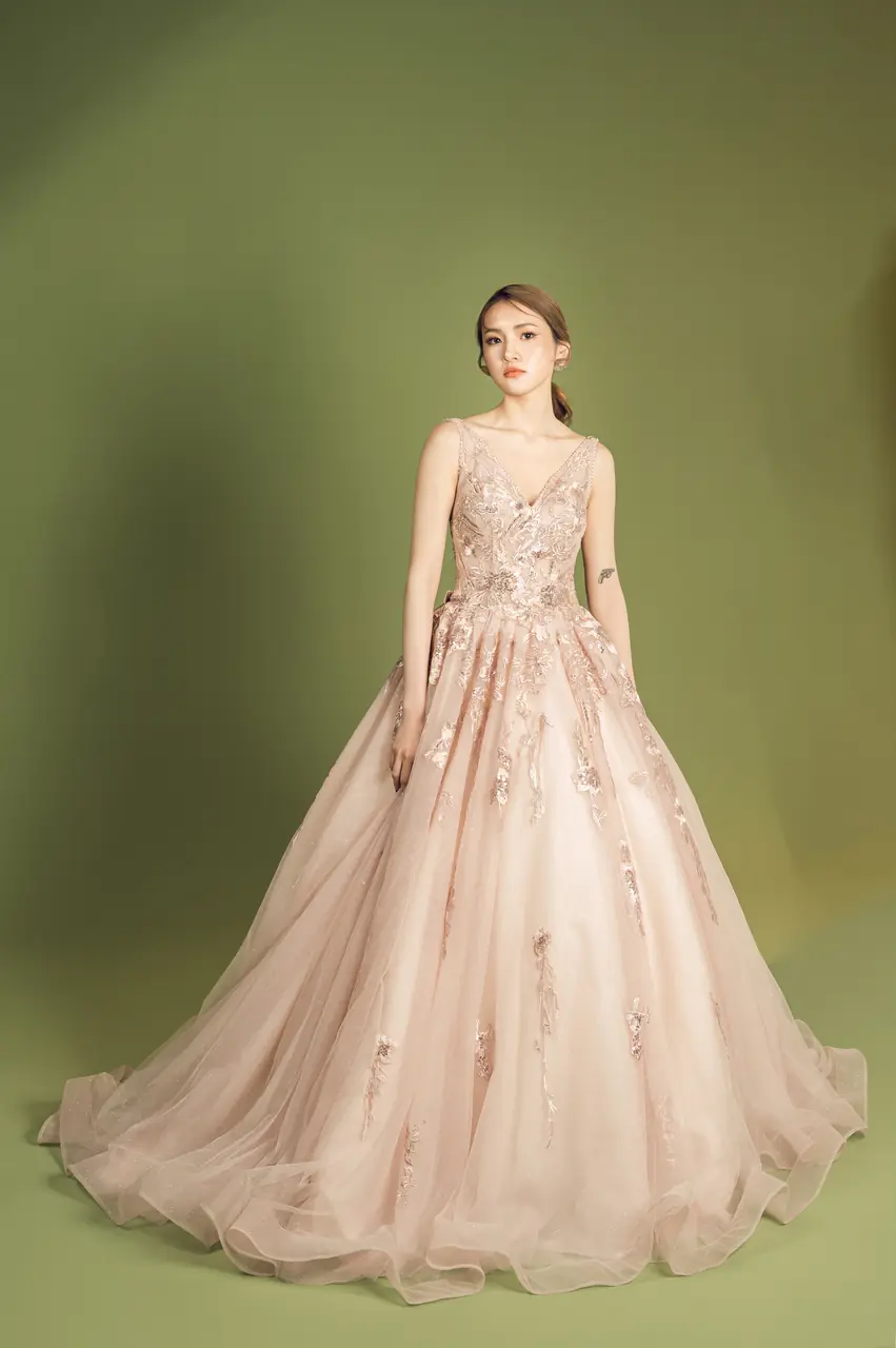 《玫瑰遺書晚宴禮服》紀錄了一封未寄出的情書——以粉色為載體,訴說溫柔與遺憾交織的情感篇章。層層蕾絲與澎裙如庭院花墻緩緩綻放,縫綴的立體刺繡,是記憶深處無聲流動的詩行。深V領的設計如同一個沉靜而堅定的決意,勾勒出情緒的波紋。它不只是一件晚宴禮服,更像是一場關於自白與釋懷的夜間演出,只為那一刻的凝視,靜靜綻放。