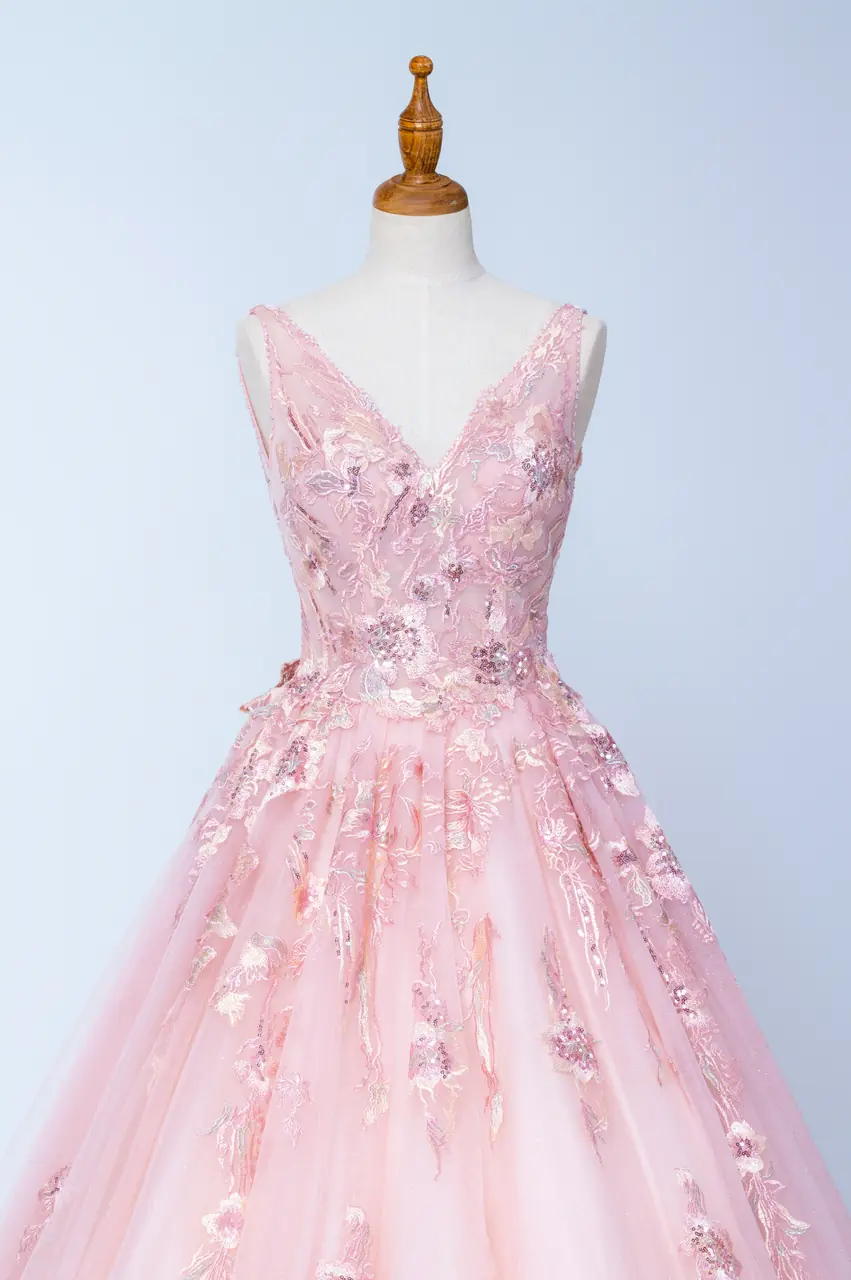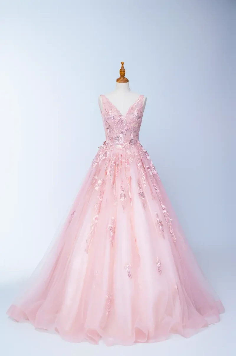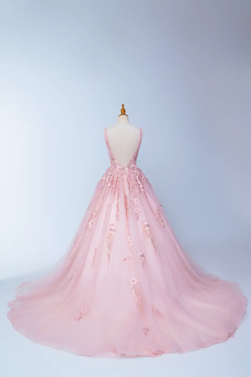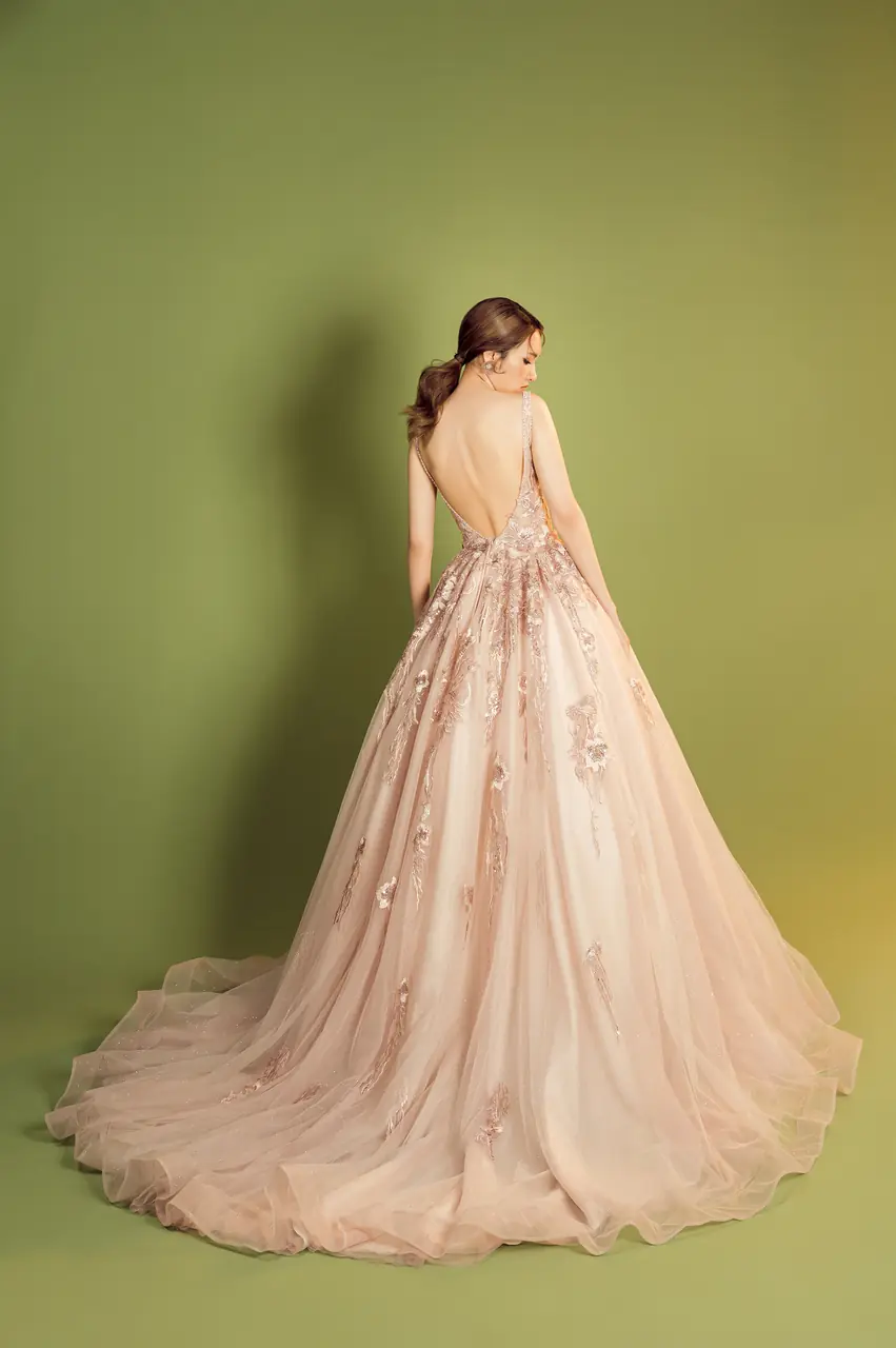 《玫瑰遺書晚宴禮服》紀錄了一封未寄出的情書——以粉色為載體,訴說溫柔與遺憾交織的情感篇章。層層蕾絲與澎裙如庭院花墻緩緩綻放,縫綴的立體刺繡,是記憶深處無聲流動的詩行。深V領的設計如同一個沉靜而堅定的決意,勾勒出情緒的波紋。它不只是一件晚宴禮服,更像是一場關於自白與釋懷的夜間演出,只為那一刻的凝視,靜靜綻放。
