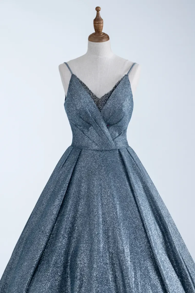 她是一首不被高聲朗誦的詠嘆調,從夜色最深處緩步而來。銀灰色的布料在光影間流動,像星辰墜落前的最後一縷脈動。細肩帶與深V領口交錯出克制的輪廓,猶如一場即將開始的沉默宣言。這件晚宴禮服,是在不言之中凝聚無盡情緒的場域,為那些無聲的情感提供一種高貴且堅定的寄託。她不屬於白晝,也不追隨繁星,她停留在靜止時刻的邊緣,守望屬於自己的銀色瞬間。