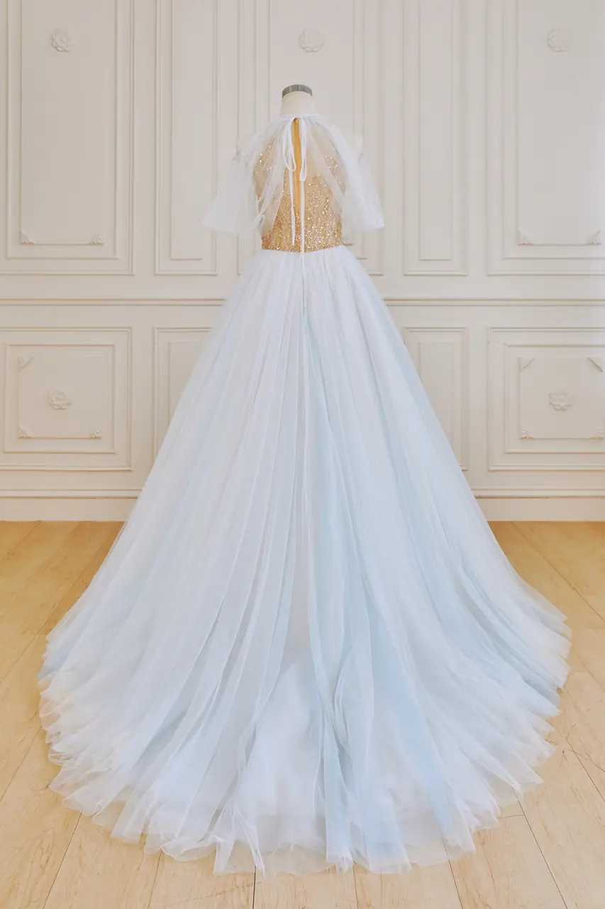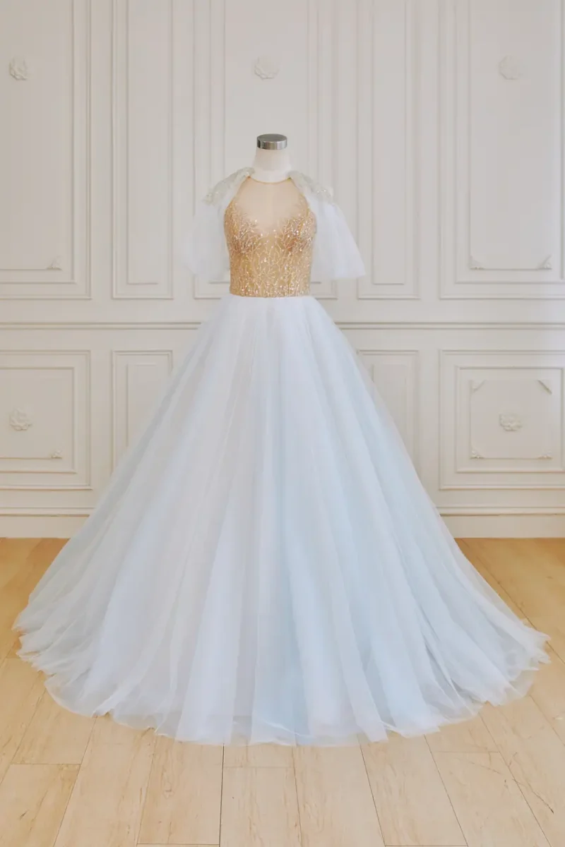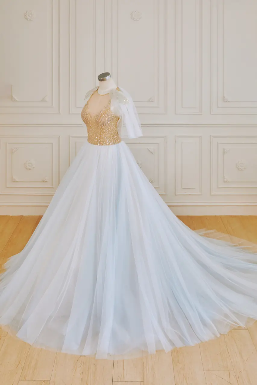 《琉光之庭》是一場靜謐的傍晚頌詩,在落日時分緩緩展開。金色刺繡胸衣如晨光撒落枝頭,細緻地攀附在肌膚之上,一如回憶中不願褪去的暖意。藍紗澎裙因光而輕盈,像霧,那些說不出口的柔情與遲疑,悄悄藏在裙擺的流動裡。這不是一襲尋常晚禮服,而是一場關於守候的場景——她靜靜佇立在華麗廳堂中,不急不徐地說出內心的等待:我一直在你夢境的光影交界,等你回頭。