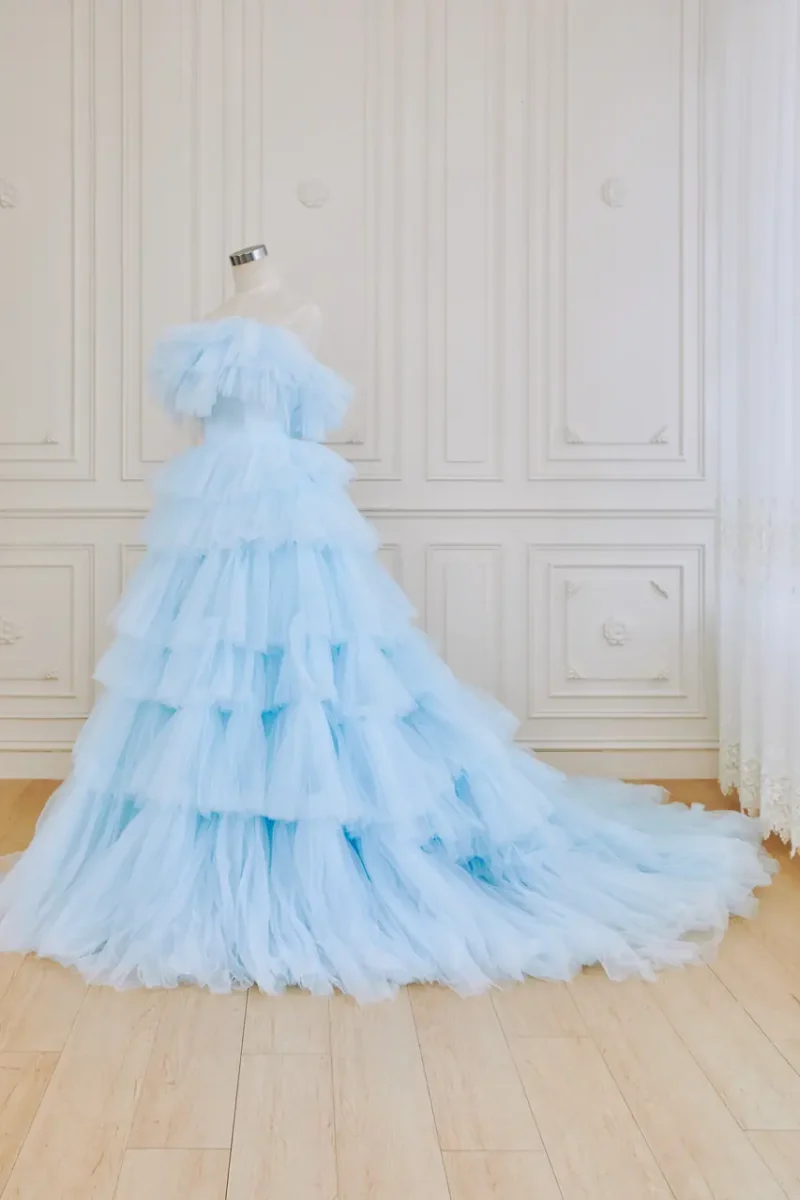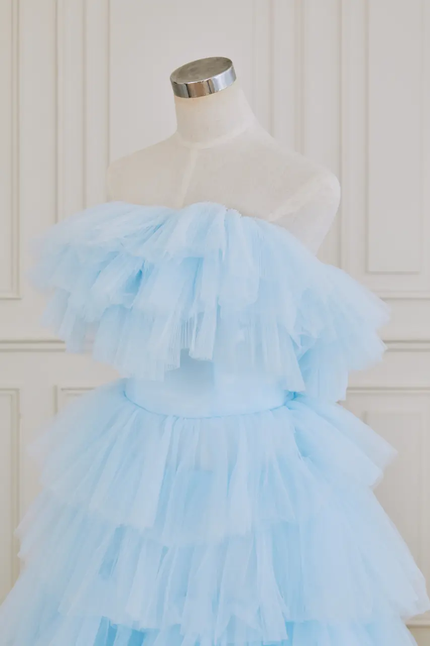 《雲映藍境晚宴禮服》是一段在風中被低語的記憶——柔軟如雲的藍紗層疊而成,如晨曦初醒時,天空尚未擁抱陽光的那抹乾淨與安靜。這件晚禮服猶如一則遺落在舊夢中的篇章,既有童話的透明感,也帶著過渡季節裡不捨的情緒。澎湃裙襬緩緩向後延展,好像風還沒說完的話,靜止在你經過的那秒。它屬於一場有光、無聲、只為心底某段柔情準備的現場——一種不需要眾人,只需自己映照的盛禮。