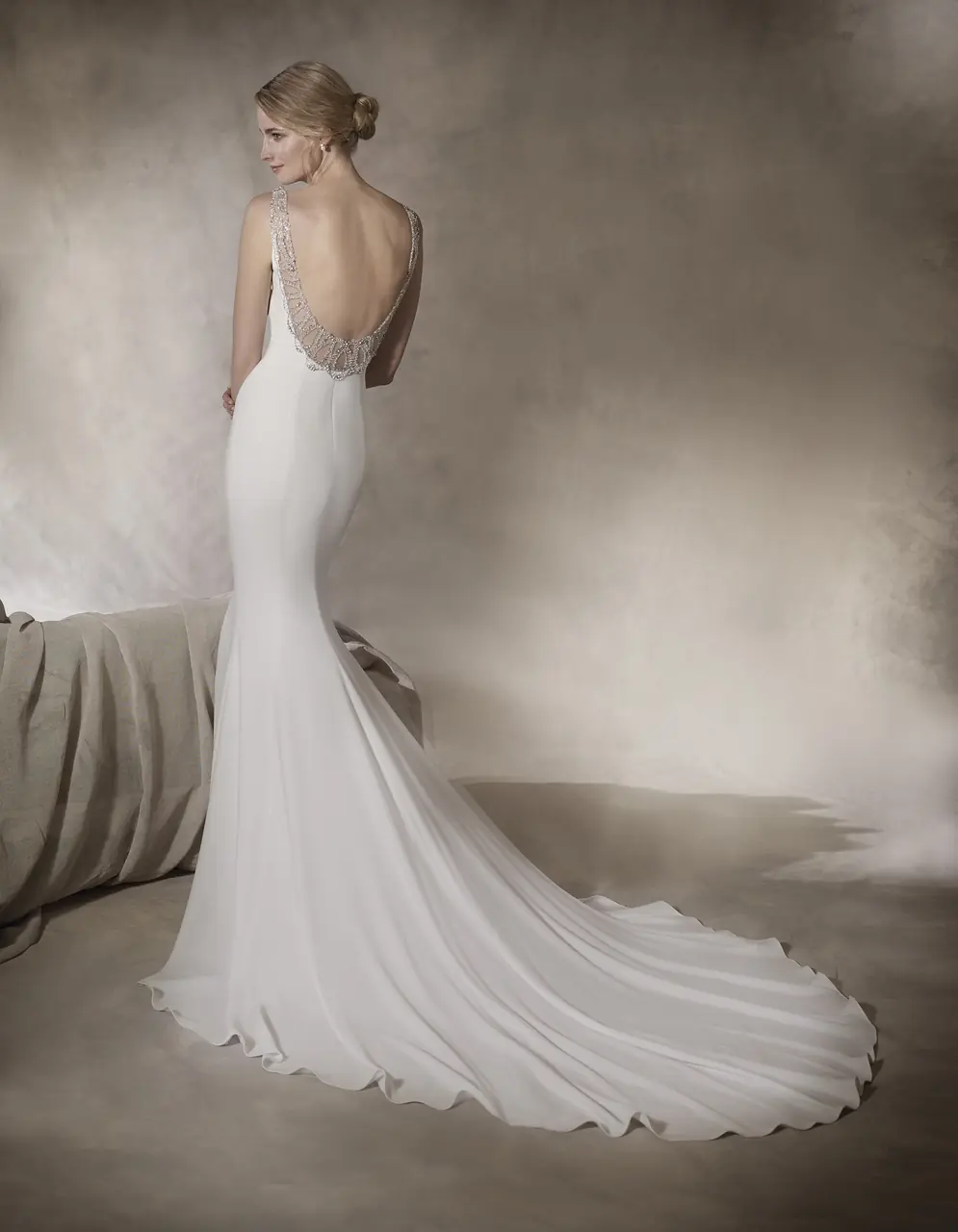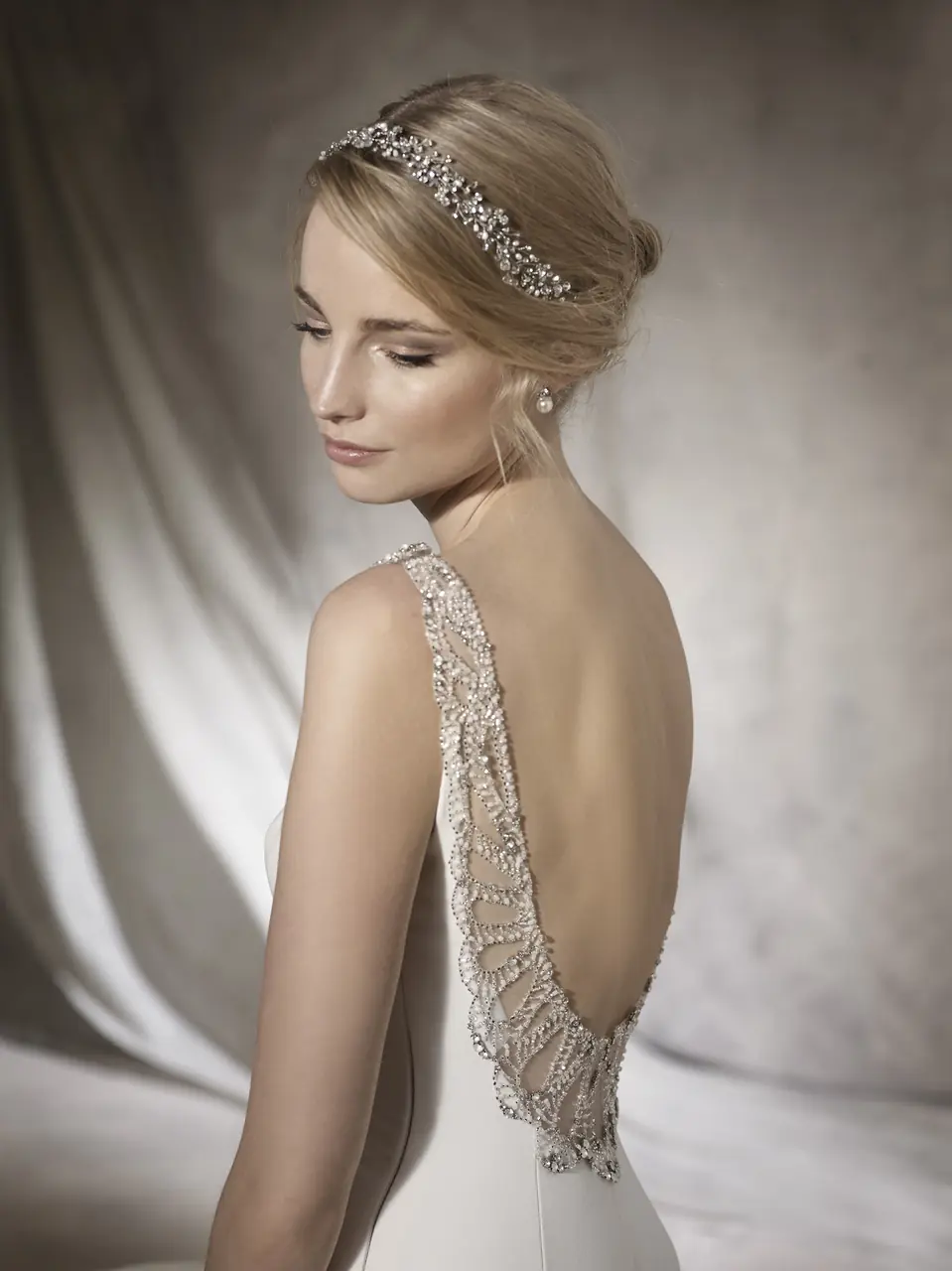 以柔和晨曦染上新娘的優雅身影,如詩般婉約的白色婚紗,綢緞流動中描繪出無可替代的美麗。