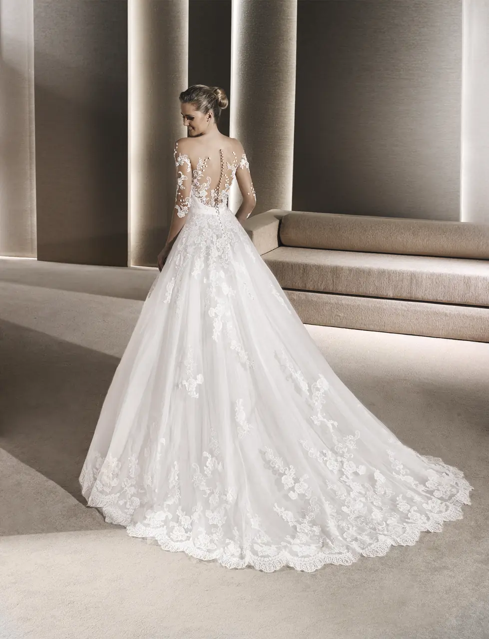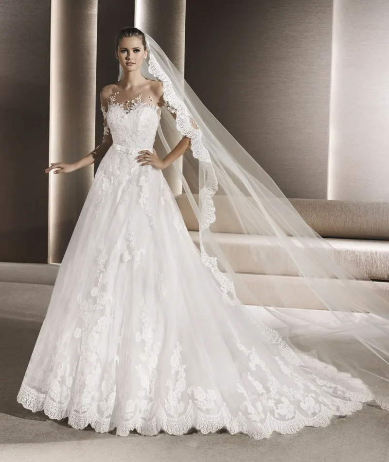 月華輕羽婚紗,宛若在夜晚的花園中盛開的幽蘭。桃心領設計讓新娘的嫻雅如月光般流瀉,而七分袖的點綴,是星光灑落肩頭的呢喃。每一片蕾絲輕穩地綴於裙間,光影若隱若現,如同晨曦微曛。在這件婚紗的輝映下,新娘將如仙子般翩翩,將愛情的夢境化為永恆。