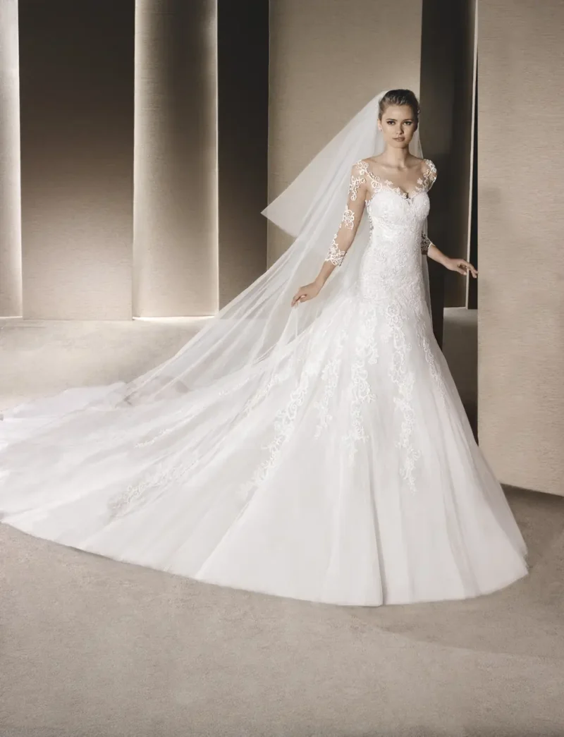 如同晨曦般輕柔的綻放,這款婚紗以優美的蕾絲雕刻出夢境般的輪廓,演繹出新娘如詩般的純淨與優雅。