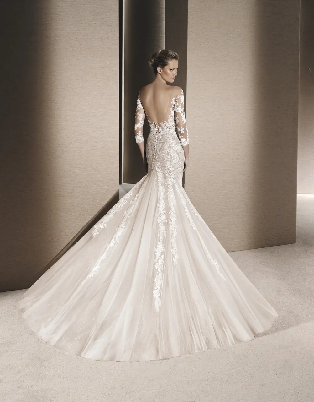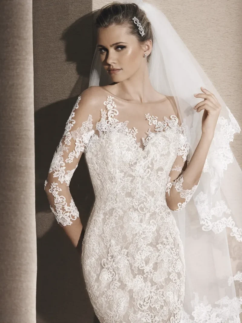 如晨曦微風輕拂,她在光影間綻放。這款婚紗以優雅蕾絲勾勒,讓每一刻都犹如夢境。