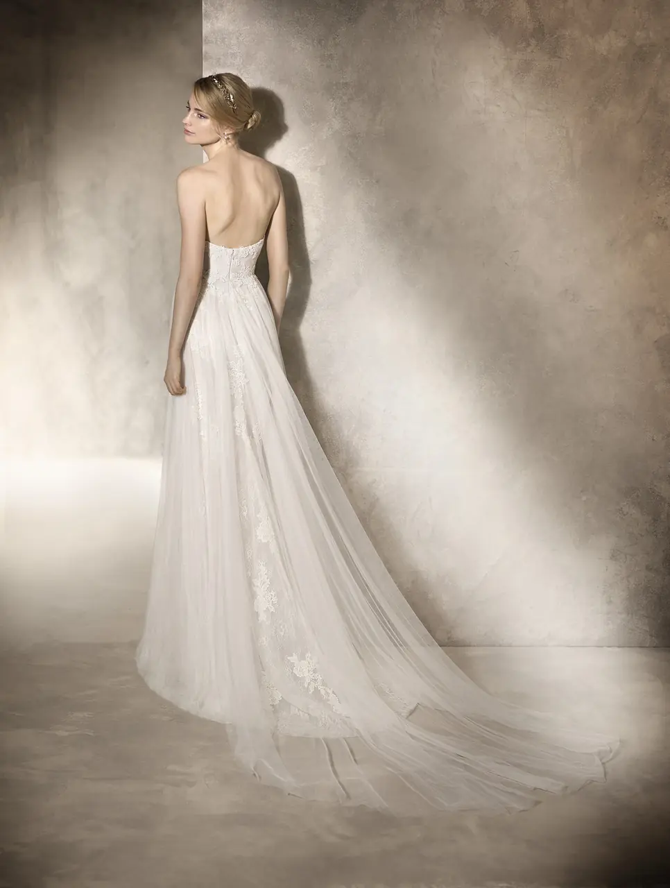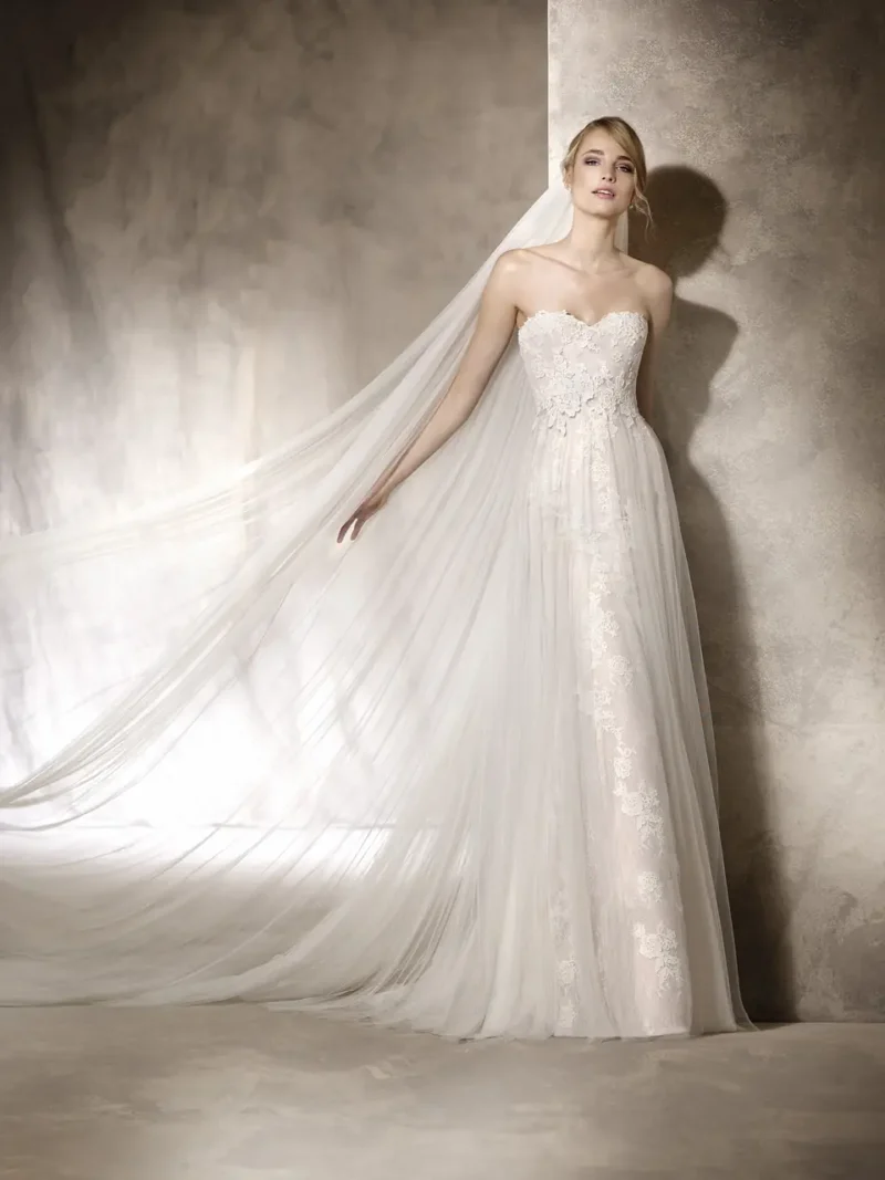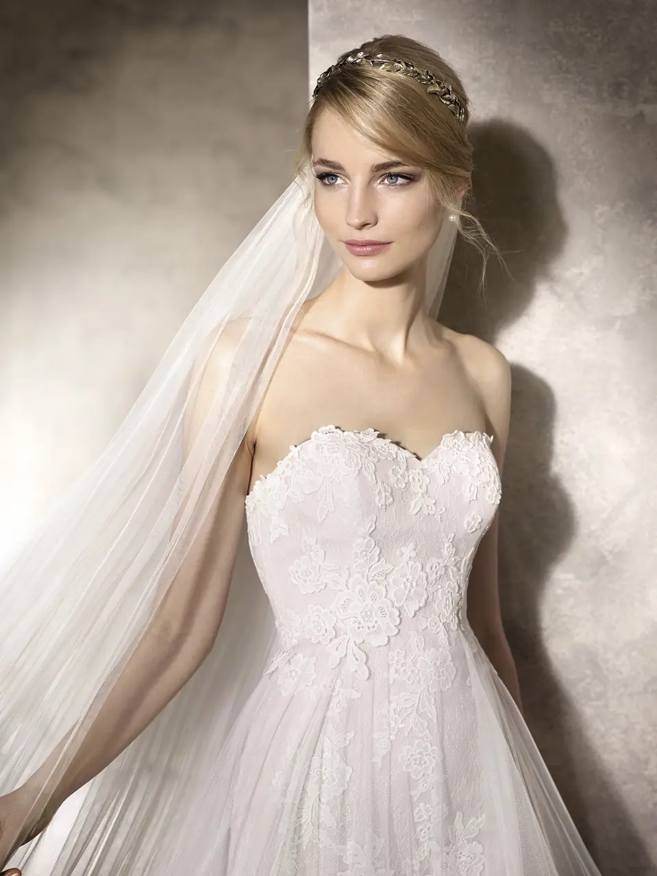 在金色晨光的輕撫下,她彷彿化作一抹盈盈白色的晨霧,和煦且神秘。這件婚紗像是將最柔和的詩意披在她的肩頭,蕾絲的細膩如同呢喃的低語,輕柔地飄灑在她的周圍。A-line的設計流瀉出流暢的韻律,宛若她心中無聲的誓言,正於微風中悄悄生長。這是一個屬於靜默與悠然的時刻,專注捕捉愛情最初的悸動與永恆。