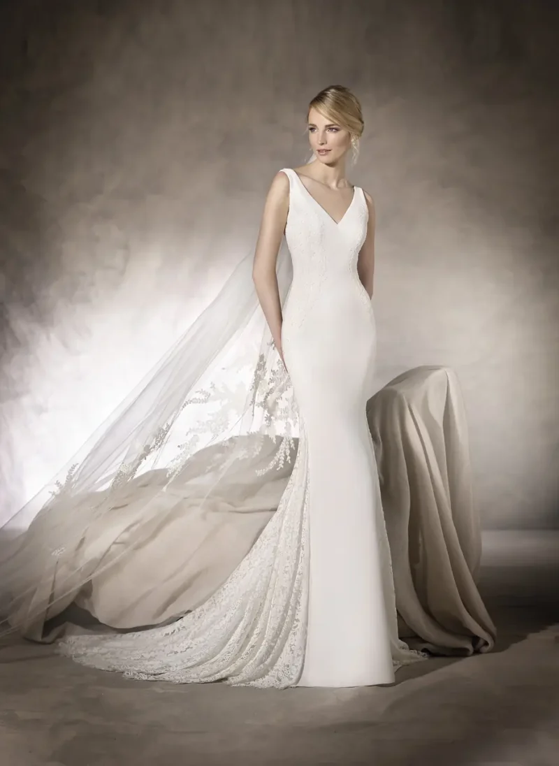 在她的梦里,那鱼尾般流动的婚纱如云影般轻盈,随风轻舞。V领展露的不仅是优雅的曲线,更是一颗坚定而柔软的心。在这场属于她的日子里,她漫步在光影交错的时光中,任由柔滑的緞面和轻盈的婚纱赋予她无言的力量,如同溫柔的呢喃,低訴著愛與承諾。