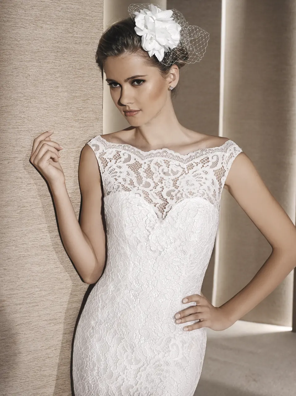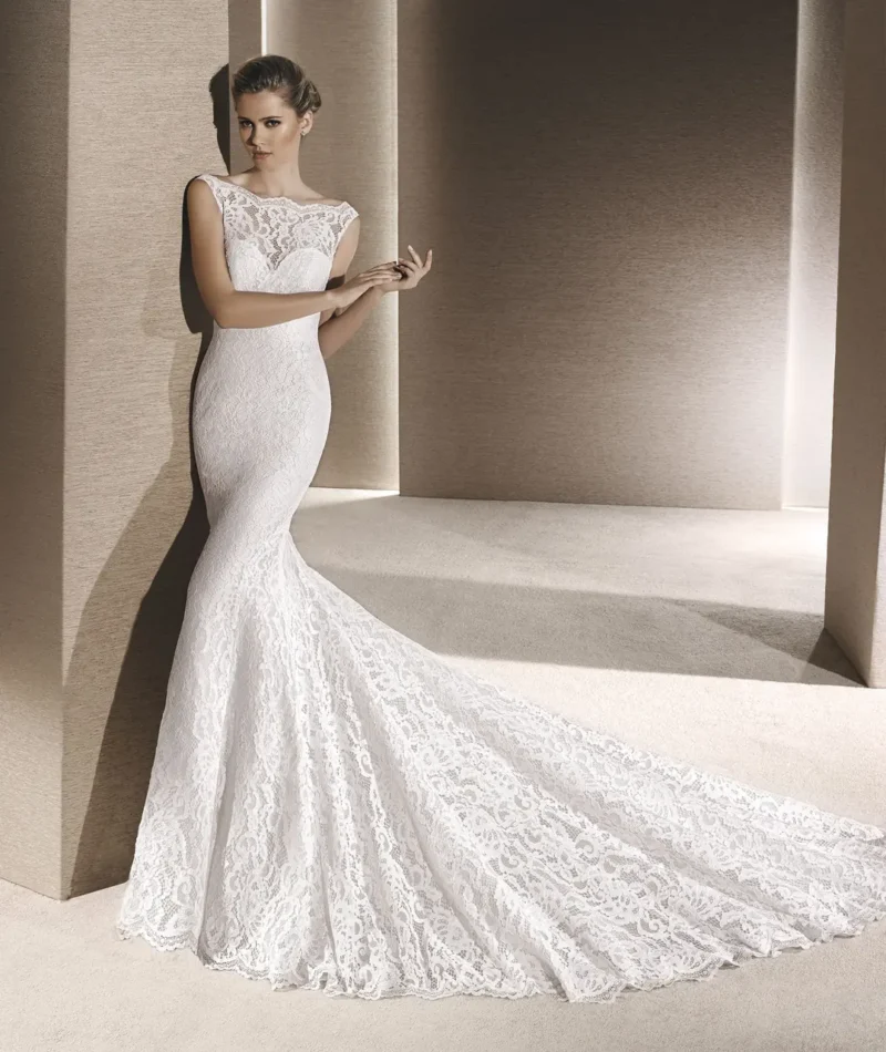 在柔和的燈光下,她站立於靜謐的房間,仿佛時間都因她而停駐。這件「靜宵薇語婚紗」以細緻的蕾絲編織出如星夜般的紋理,一字領與卡肩設計勾勒出優雅的脖頸線條。當她輕步走動,魚尾裙擺在身後潺潺流洩,如呢喃的夜語。這是一場屬於夢境的婚禮,她是夜的主角,將愛的低語隨風傳遞。