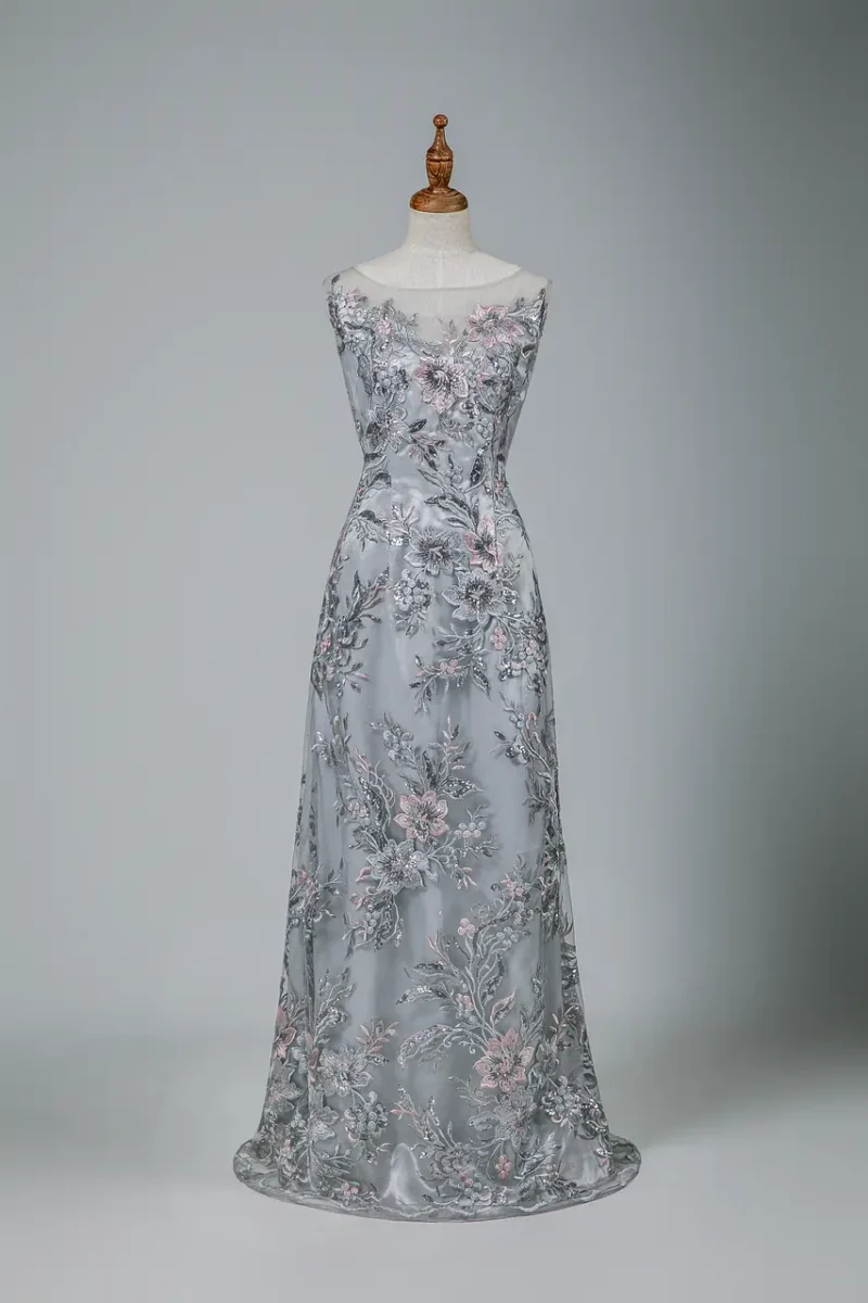 這是一襲像記憶一樣深遠的煙灰色禮服,在微光下閃爍著銀灰與丁香粉交織的亮片,彷彿靜謐晨霧中初綻的花朵。圓領與無袖設計營造出沉穩大氣的線條,映襯一位母親低調優雅卻傲立如松的姿態。她不張揚,卻自帶光芒;當她走入會場,便如同雨後之景,洗盡鉛華,也讓回憶溫柔地盛開。這不僅是一件禮服,更是她生命故事的刺繡篇章,為孩子的婚禮,寫下最動人的出場。