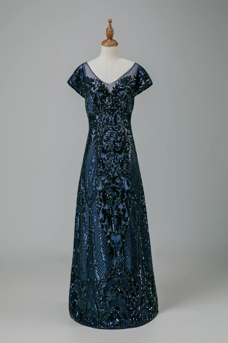 這不是一件單純的禮服,而是一段靛藍夜色中母親記憶的詩篇。一如她在婚宴上靜默而立,舉手投足間是歲月雕刻出的優雅與力量。《流影靛語媽媽禮服》以深藍亮片蕾絲交織出靜夜中流動的光影,A-line剪裁修飾身形,短袖與V領設計則在克制中透出柔軟。它為不言愛的母親留下最深刻的一幕,也為婚禮的畫面添加一筆厚重的情感光澤。