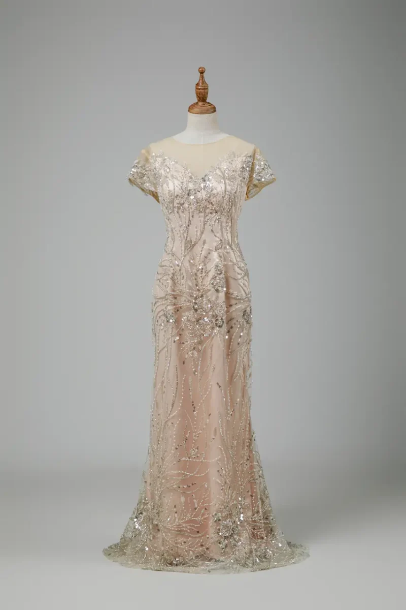 這件名為「寂光林語」的媽媽禮服,是為那些用沉靜目光守護愛的女性而設計。金色亮片如秋日微光灑落枝頭,於蕾絲間描繪出樹影婆娑的景緻——是母親身影在時光裡的倒影。她不語,卻總是場景中最深刻的光源。A-line 的線條輕輕垂墜,如林蔭道般舒展大氣,宛若記憶中那雙總在婚宴間四處遊走的眼神,溫暖堅定。它不只是一件禮服,而是一段關於愛與靜謐的篇章,在每一次回眸中,低語著歲月的詩。