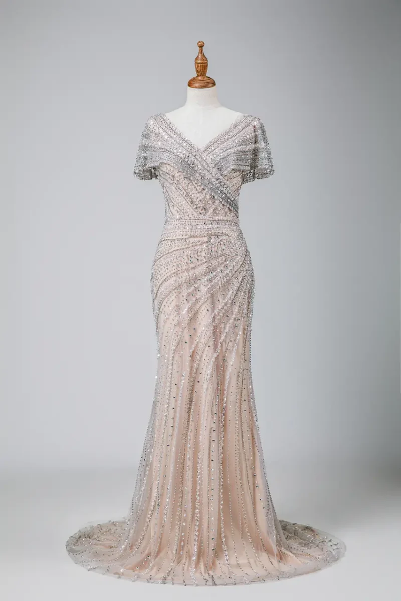 這件禮服為時間寫下一則低語的詩——以魚尾剪裁勾勒穩重與優雅,用金色與銀灰交織出的光芒,彷彿記憶中母親為家庭燃亮的每一盞燈。無數細膩鋪排的珠飾流轉,像是歷經歲月後不曾褪色的慈愛與初心。胸前交疊的V領與短袖設計,不只是造型,而是包容與保護的姿態,是溫柔也是力量。這不僅僅是一件母親的禮服,更是一場關於陪伴與成全的深沉告白——於婚宴的星河中,母親低聲說:一切剛剛好。