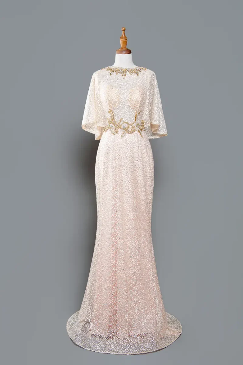 《靜金藤影媽媽禮服》透著米色的柔光如落日餘暉,在金藤刺繡的纏繞中低語母親的溫柔與剛毅。裙身宛若被午後微風揉過的蕾絲綻野,飄袖恰似垂落枝頭的藤蔓,覆在肩頭柔和延展。這不僅是為婚禮準備的一件禮服,更像是一段時光的禮讚——她從不喧嘩,卻用沉靜的姿態守護著每一個重要時刻。穿上它,彷彿走入金色藤影下的記憶林徑,將那份低語的愛,靜靜傳遞。