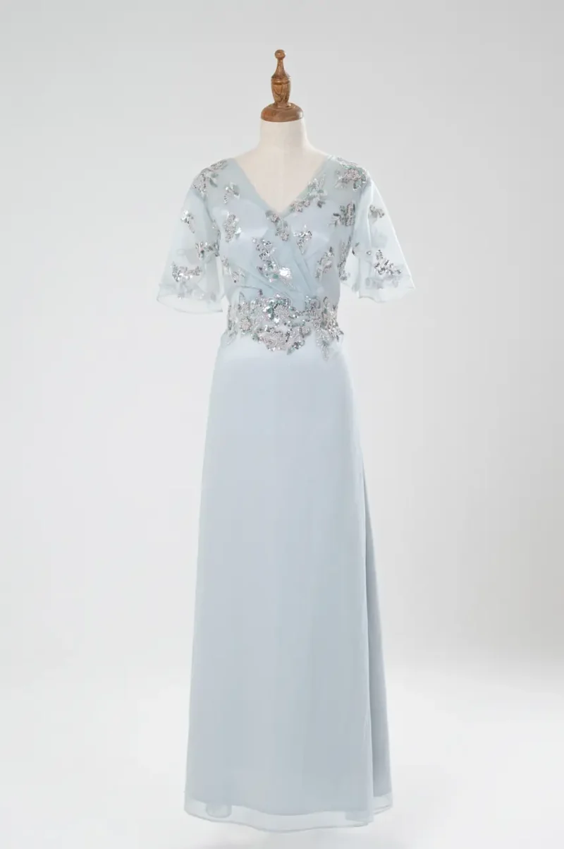 如清晨霜雪落於靜謐花苑,這件霧灰色A-line媽媽禮服以柔光蕾絲訴說時光的柔情。V領剪裁輕巧描繪出母性的溫柔弧度,短袖上的銀白繡花如夢境中微雨輕落,勾勒出一場緩慢卻深刻的情感吟詠。這不只是一件禮服,而是一段關於守候與把愛遞出的故事。在孩子禮成之日,當母親披上它,便如冬末初春的那一抹光,靜靜地照亮那場畢生所願。
