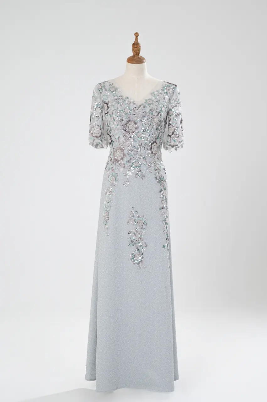 「薄暮花雨」是一首柔軟而深刻的情詩,獻給那位在家族中靜靜綻放的母親。禮服以灰藍為底,仿若暮色初降,將光影靜靜收攏。精緻的蕾絲花紋從胸前延展至裙擺,如同微雨中開放的庭園,點點閃爍的亮片彷彿藏著過往歲月的微光。V領設計優雅而溫婉,短袖帶來從容與端莊的平衡。這是一件有故事的衣裳,屬於那位不語卻始終是光的人,踏著這身柔情,走入子女最重要的時刻,宛如時間裡的暖光被重新頌唱。