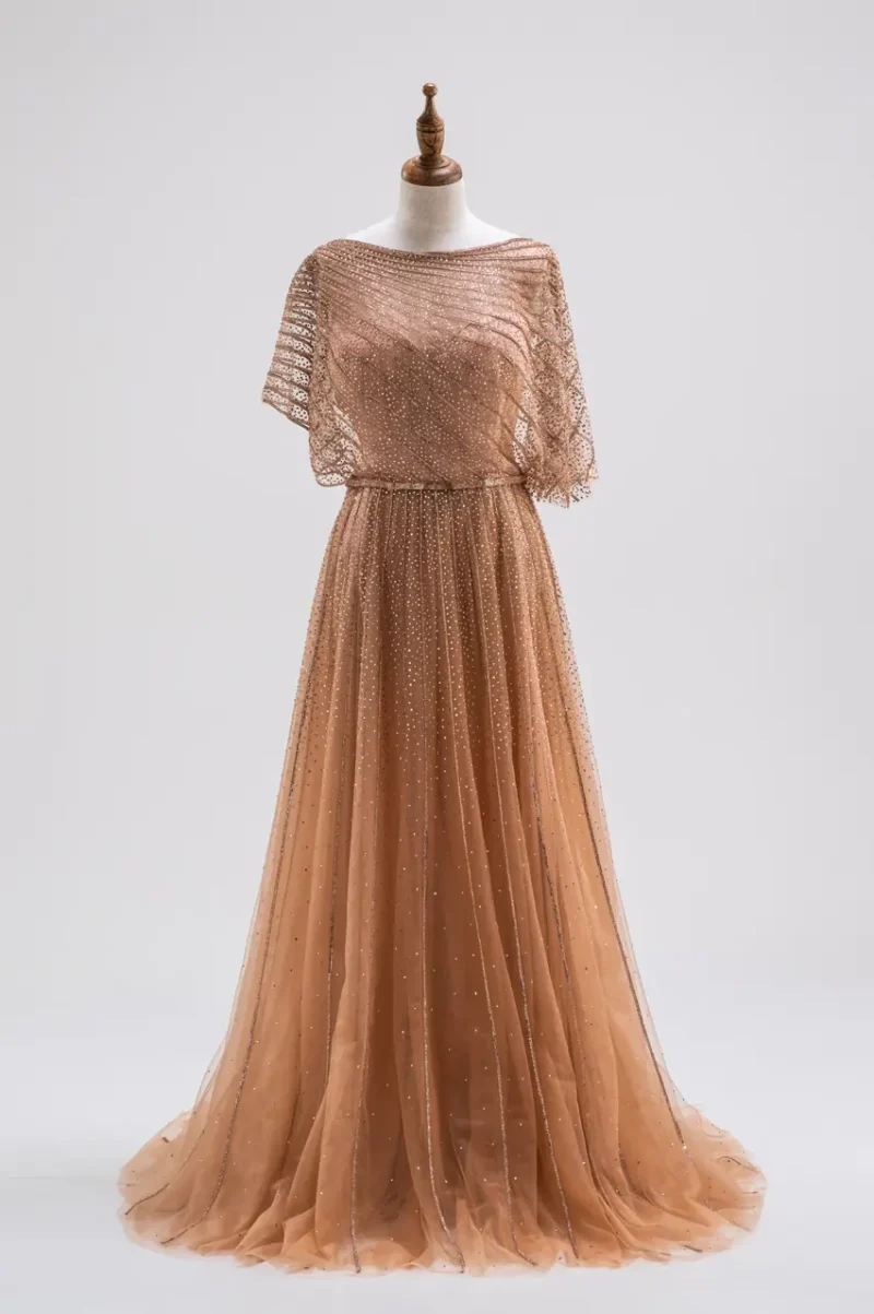 這是一件專為母親節奏打造的禮服,如午後陽光穿過窗簾灑在木頭家具上的淡影。流光杏影媽媽禮服以金杏色亮片蕾絲編織,旗袍領的設計似一縷記憶的留存,優雅卻帶著自持的莊重。A-line 廓形如她走過人生旅途的穩重步伐,裙擺隨光微動,彷彿訴說著那些無聲卻深刻的愛。她不是為了成為焦點而存在,而是讓一切因她而有光。