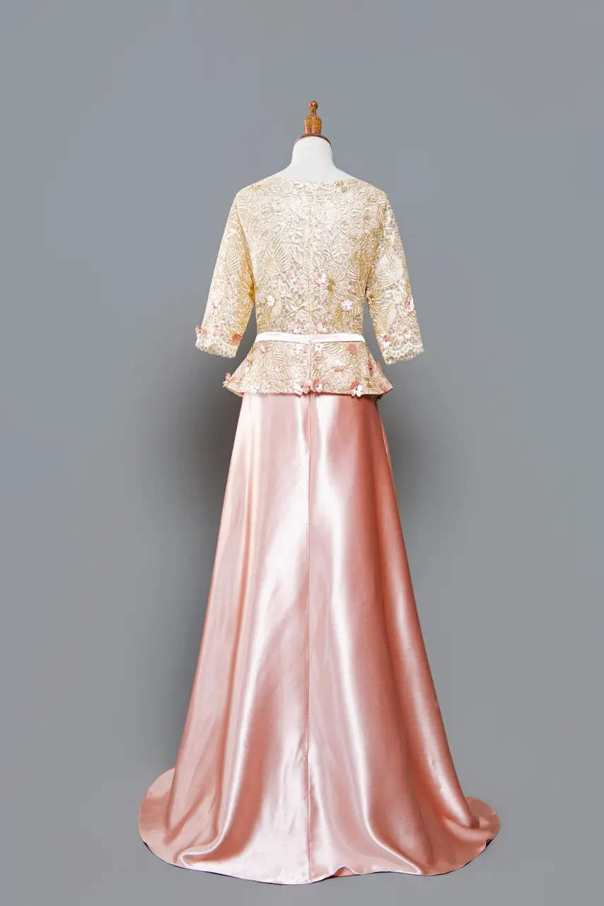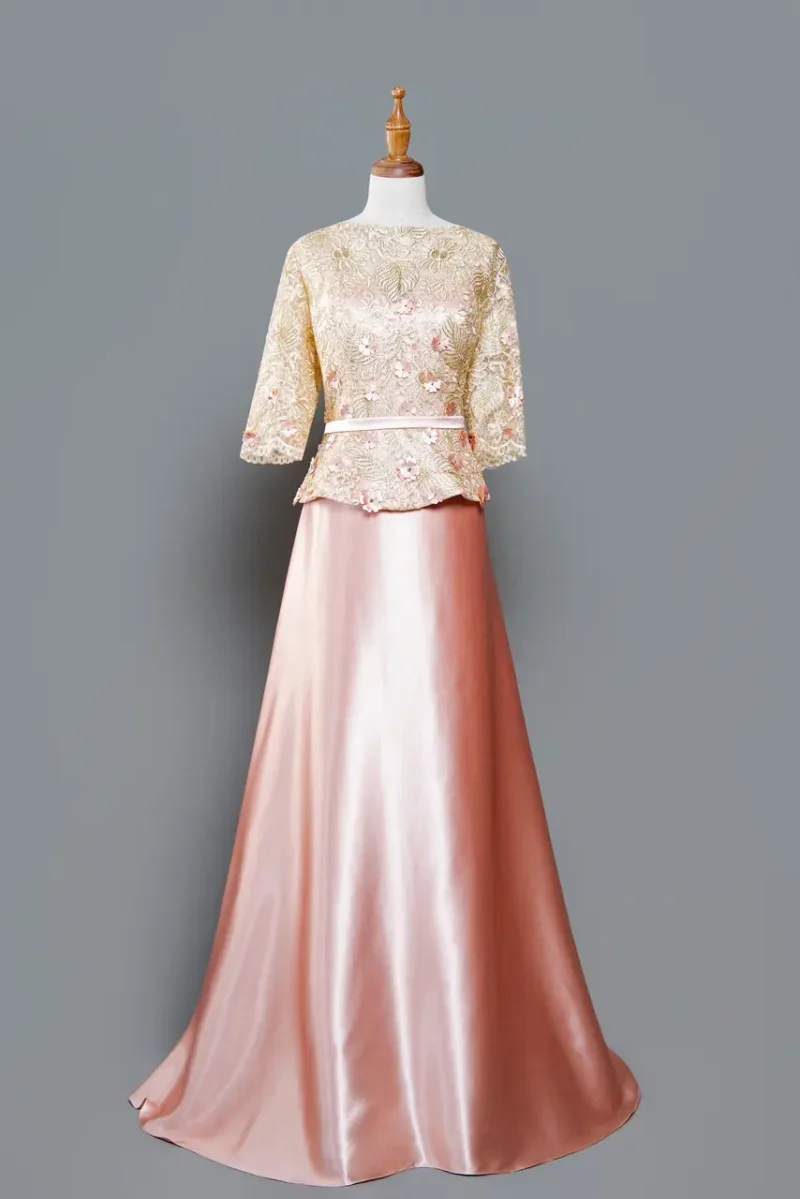 「玫露餘暉媽媽禮服」如微涼傍晚中的一抹光影,金色蕾絲自肩頸緩緩鋪展,繁花點綴其間,彷彿母親眼中的星點愛意。香檳與玫瑰金滑緞交融,在燈光下如流水般閃耀,裙擺拾起的是歲月贈與她的溫柔與力量。這不僅是場婚禮的出場,更是一位母親在人生命冊上寫下的溫厚篇章。她不必說話,穿上這件禮服的那一刻,全場便知,她是誰的起點,也是誰永恆的牽掛。