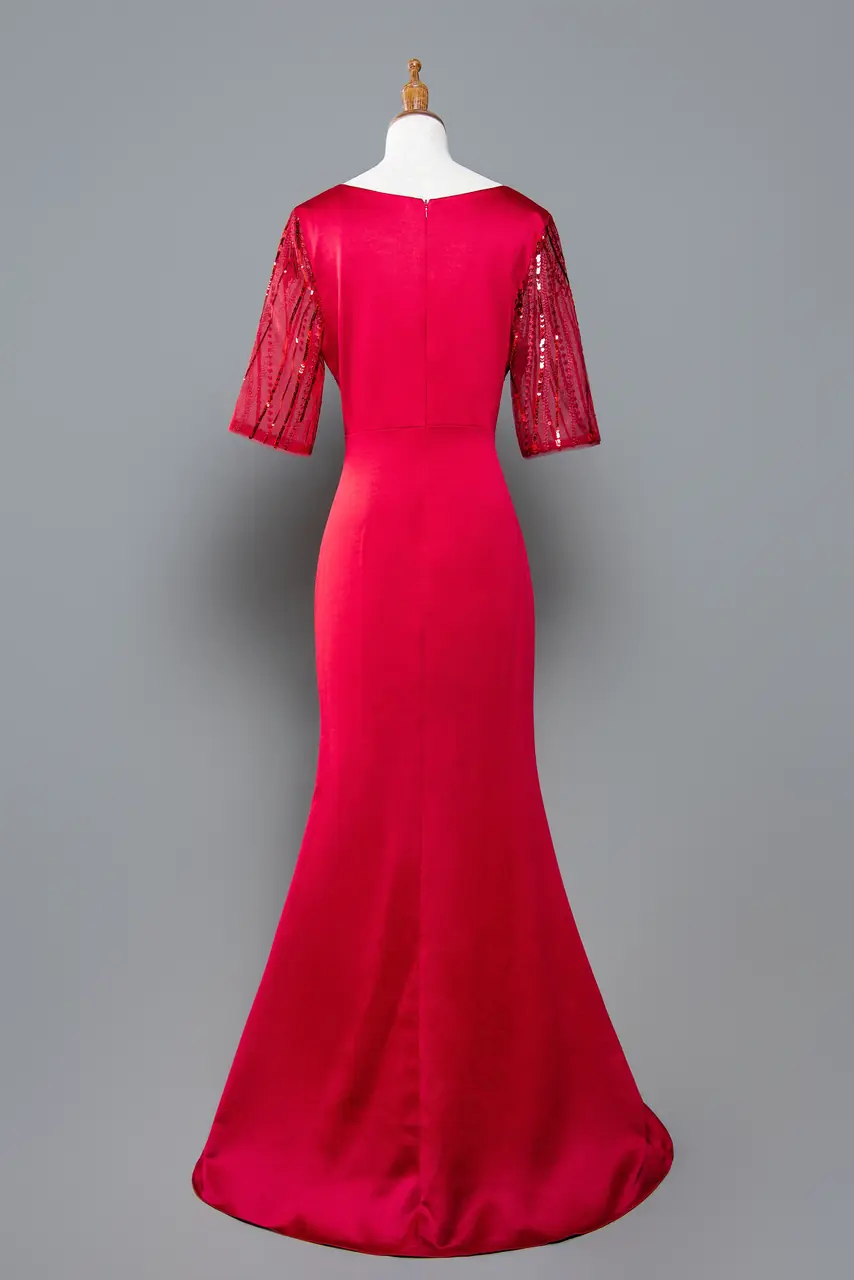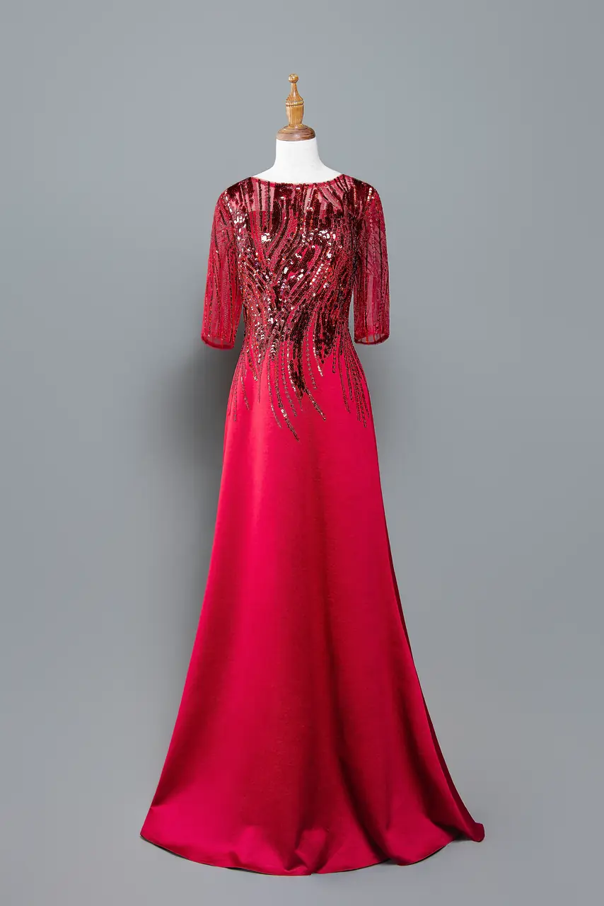 這是一場屬於母親的莊嚴序曲。『玫焰序曲媽媽禮服』以濃郁紅緞構築溫暖與自信,每一道線條皆為記憶的載體,訴說著時光的沉澱與愛的深厚。七分袖綴以細膩的亮片蕾絲,低調而堅定,猶如母親始終不語的守護。她或許不在台前,卻是婚禮背後最燦爛的焰火。讓這一襲紅,成為親情與榮耀交疊的記號。