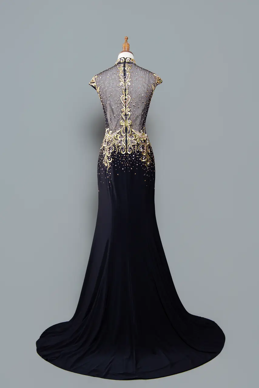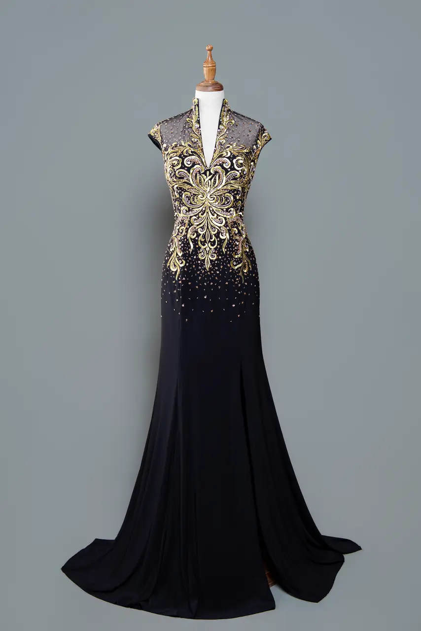 那是一席為母親設計的時光長詩,在漫漫歲月中沉澱出深色的優雅輪廓。黑色魚尾裙身,如夜空靜煉,如記憶深處不說的溫柔。胸前金燦刺繡如燄,像她一路沉穩走過的光,從不張揚,卻照亮家中每一人的方向。V領與包袖設計,為身段添上尊貴剪影,展現大器的從容與智慧。這不是一件禮服,而是一位母親,穿上自己的權威與慈愛,站在孩子婚禮的那一端,靜靜陪伴。