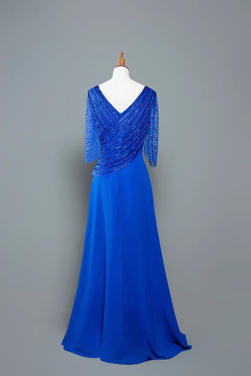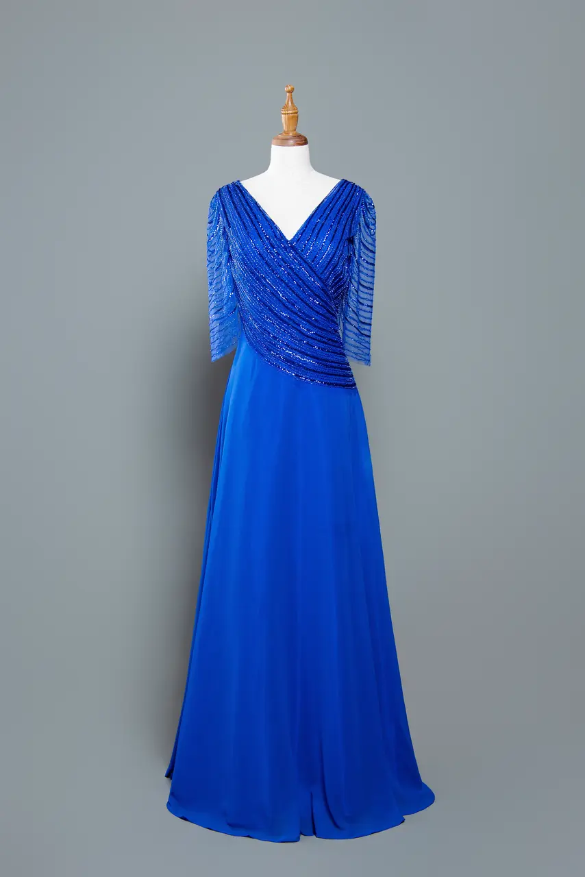 「深海低語媽媽禮服」以深藍為語言,靜靜說著一位母親的溫柔與堅定。亮片雪紡宛如晨曦灑落海面,交織出記憶的光紋,V領與紗袖的設計兼顧優雅與包覆,像是一種靜靜的守候,不張揚卻無比篤定。A-LINE裙擺輕盈流動,彷彿那一路牽引女兒走向新生的步伐,在眾人注目的婚禮現場,是一種不言而喻的光芒。這不只是一件禮服,是媽媽的角色轉身,是倚海而立的無聲祝福。