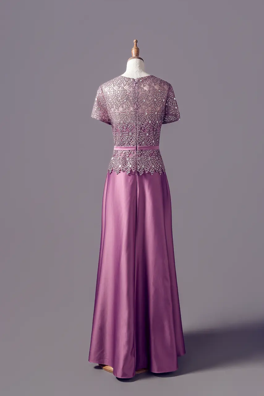《暮丁香影媽媽禮服》以深邃紫藤為情緒的底色,編織出一段沉穩且充滿愛的故事。細緻蕾絲覆蓋上身,宛如歲月灑落的光影,在鏤空花紋中訴說著時光的溫柔與優雅。小包袖與V領設計,藏不住心中深情,是母親在婚禮那日最溫暖的凝視。一筆緞面的垂墜,輕輕迎風搖曳,如她無聲的祝福。這件禮服屬於在場邊靜靜守候,卻是愛的中心點的她——母親。