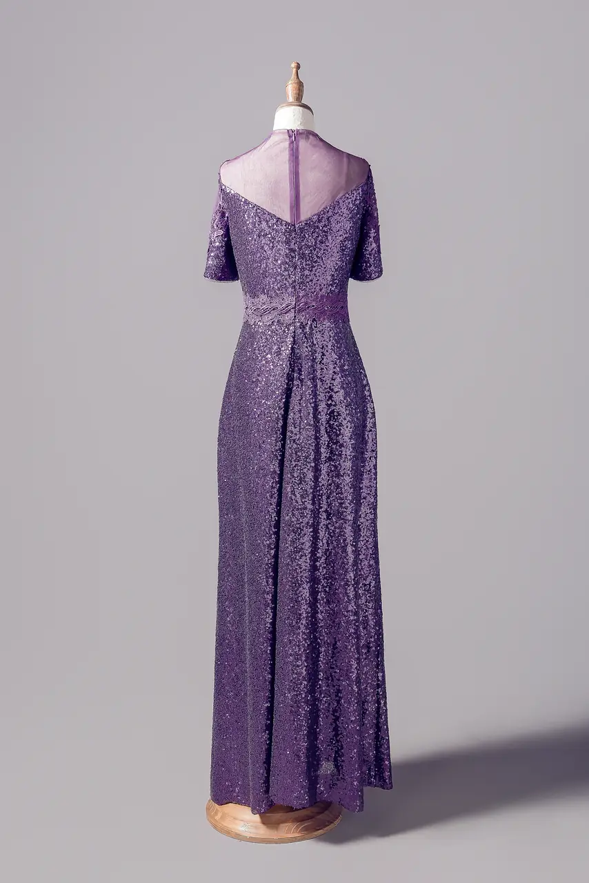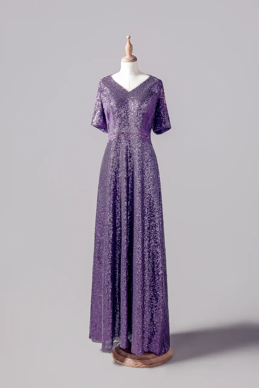 「暮耀紫藤媽媽禮服」以潤澤紫光與精緻亮片蕾絲交織,如花園中晚暮時分柔光掠影。流暢的A-LINE剪裁與小包袖設計,彷彿將她曾經的堅毅與溫柔融成一場溫婉的流動。V領微啟,不嘩眾取寵,僅以內蘊光芒述說這位母親在宴會廳中、在最親愛的孩子婚禮之日,靜然守候的身影。一如紫藤,以沉穩的姿態盛開,只為那一刻的珍重與祝福。