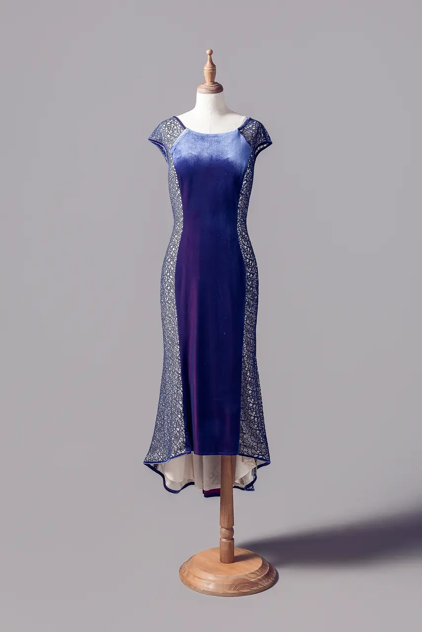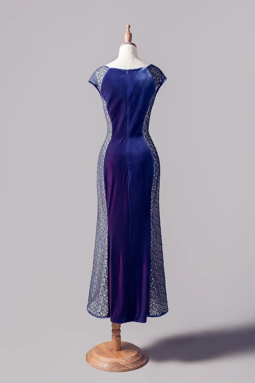 《暮海深藍媽媽禮服》是一場為記憶編織的頌詩。深邃藍色絲絨交織著蕾絲邊界,如同潮夕之際,晚霞映在母親不語的深情裡。魚尾線條婉轉勾勒歲月的優雅軌跡,小包袖與圓領設計讓她穩重卻不失風骨。她不是配角,而是最靜謐而奪目的存在。在婚禮這天,記得回眸──那抹藍色,便是最安靜也最濃烈的愛。