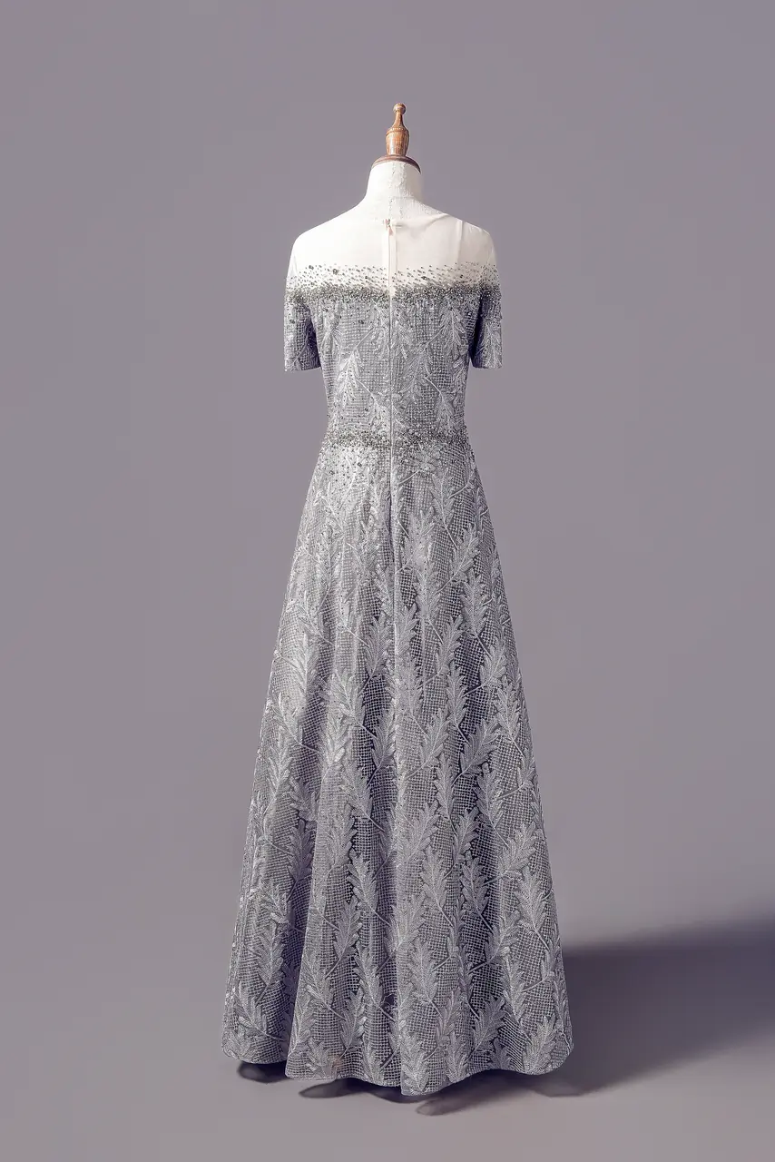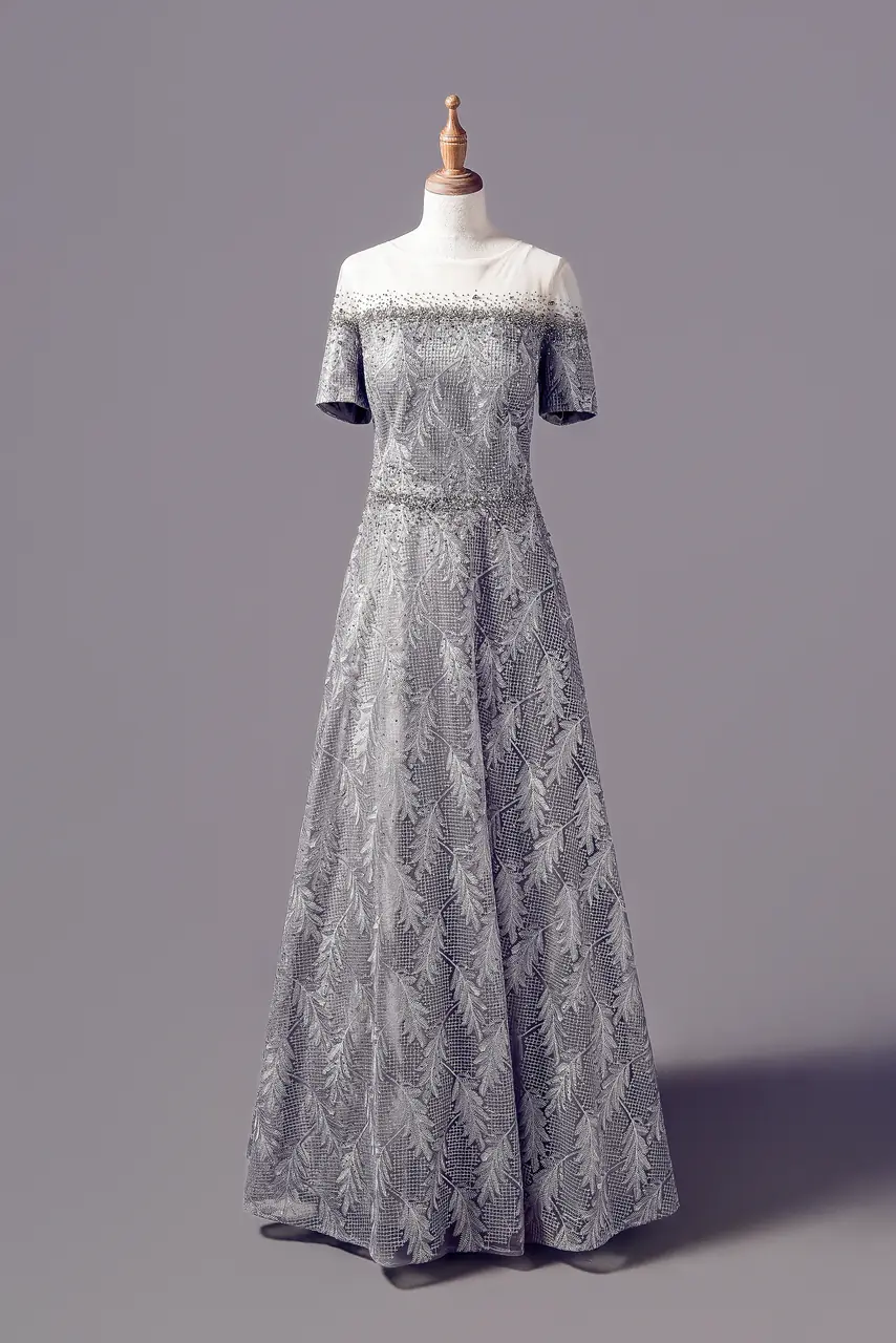 在一場綻放子女幸福的婚禮上,她身披灰燼羽語,如凝結時光的沉靜女神。這件禮服以霧灰為底,揉合亮片蕾絲所勾勒出的羽葉紋,即是生命歷程中繁華與簡靜的交織。卡肩與一字領設計不彰自顯其溫婉姿態,輕柔擁抱著肩與頸的曲線;A字裙擺展開,是她用溫度擁抱整個家的姿勢。這不是一件服裝,而是母愛在場域中最安定的顏色。是她靜靜站在那裡,就足以讓孩子感到被愛與成全的一刻。