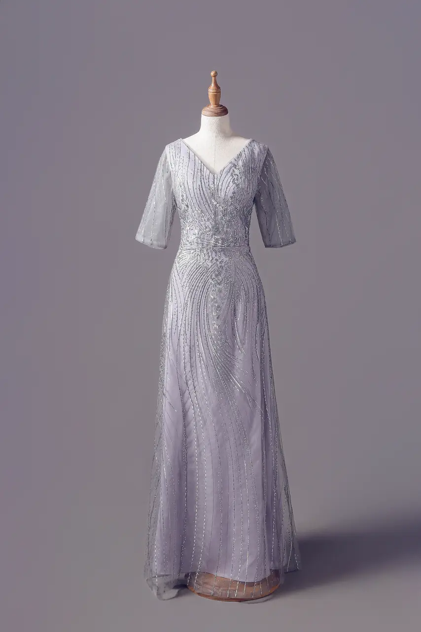 這不只是一件媽媽禮服,而是一段時間的低語。銀灰蕾絲交錯成細緻光脈,如夜空中靜靜流動的星河,隨著她的步履自信延展。一襲V領設計溫柔收束視線,五分袖自在落下,不張揚卻深藏力量。她站在子女婚禮的場景中央,以從容與溫柔見證愛的誓言。這件禮服,像是一整段生命記憶的穩定背景,靜靜閃耀,無聲地祝福。