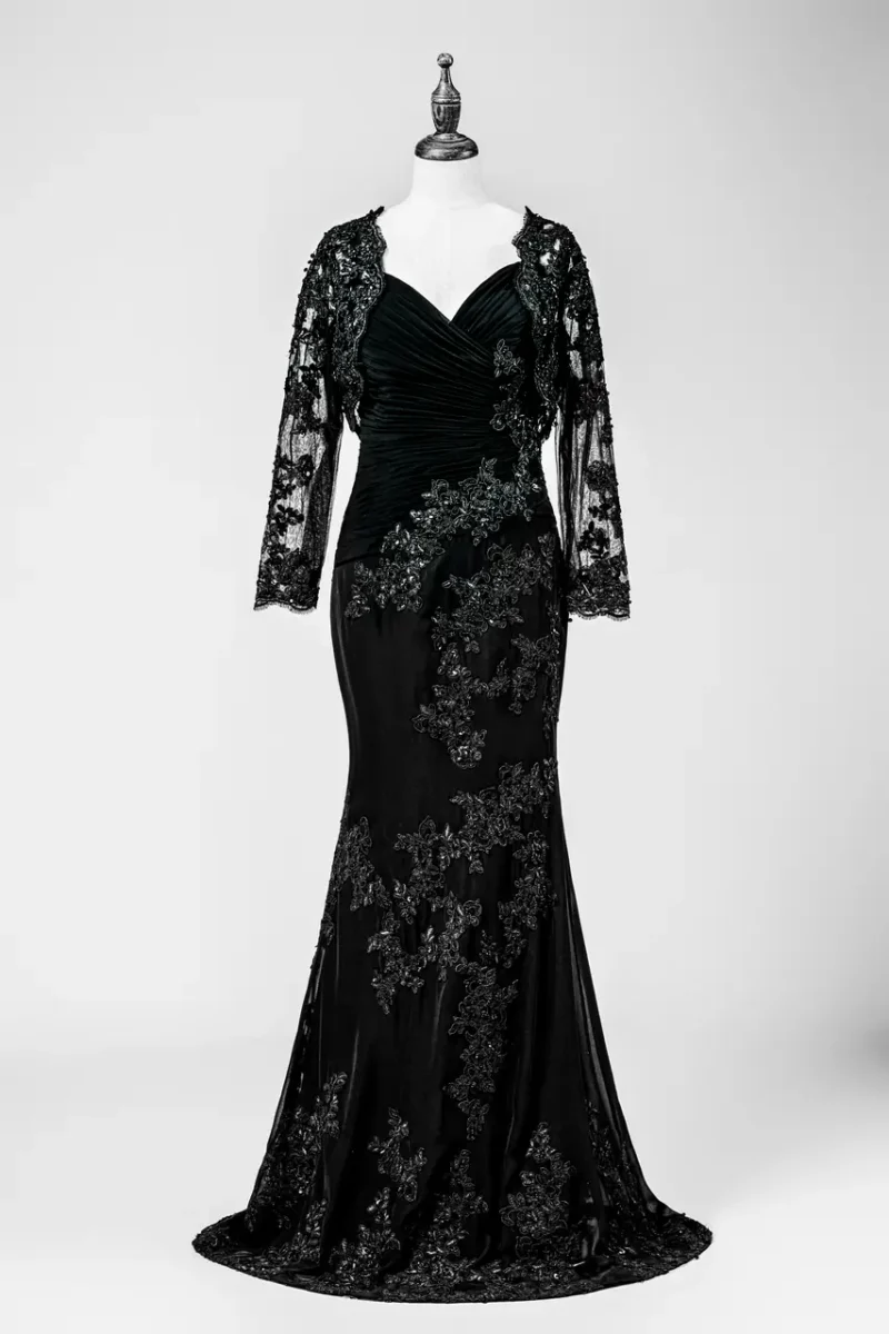 這是一件關於沉穩與深愛的禮服,如夜蔓蜿蜒而生,靜靜圍繞著她作為母親的堅韌。深邃黑絨之上,繁複的亮蔓刺繡恍若記憶之藤,交錯出一生守候與溫柔的抒寫。桃心領口溫婉卻挺立,透露出歷經歲月後不曾退讓的氣度。晚宴燈光下,每一道閃爍皆似歲月給予她的勳章,低調卻奪目,為這一刻的她,溫柔伸展。夜色下,她不再只是賓客的母親,她是整座宴會場域裡,最令人駐足的背影。